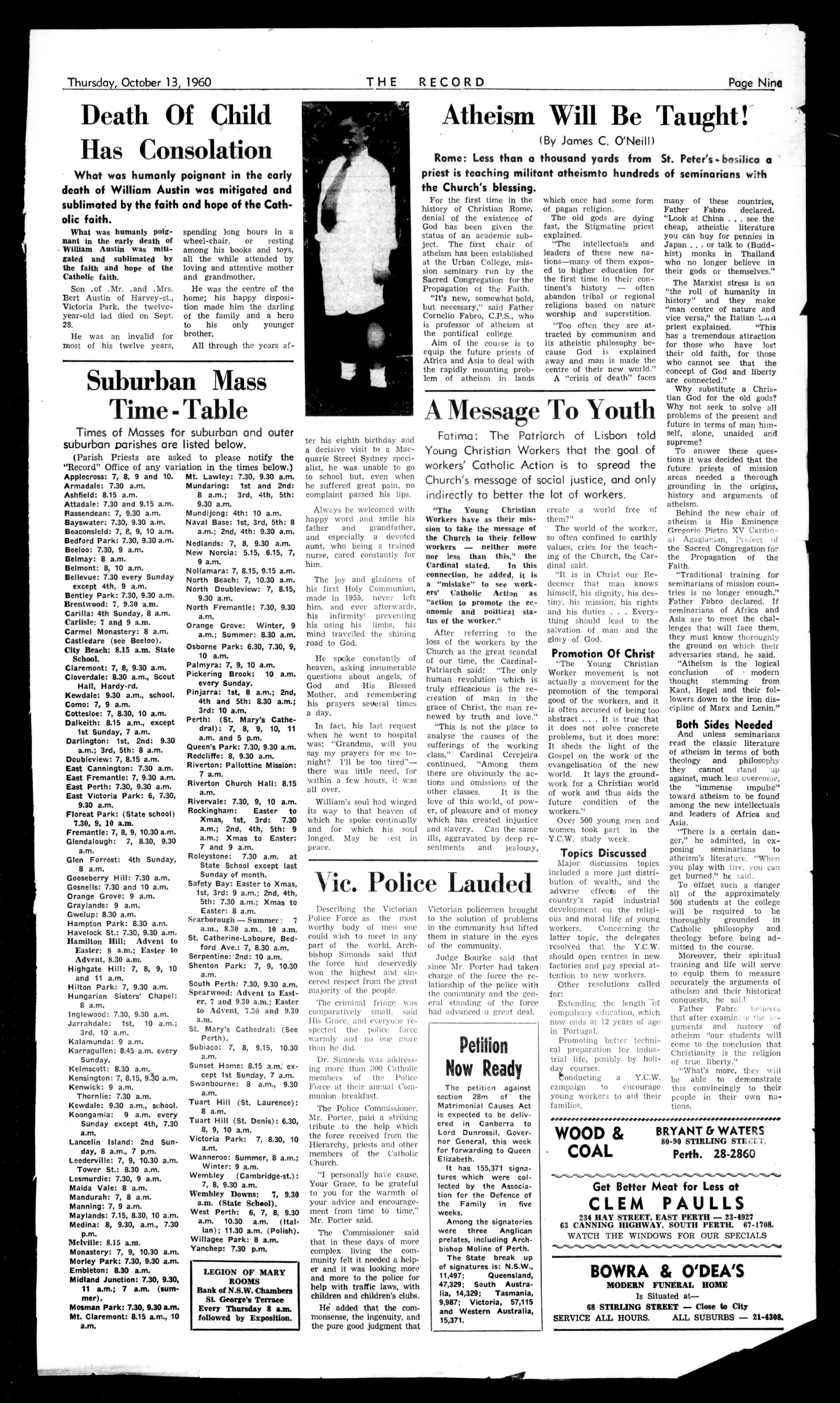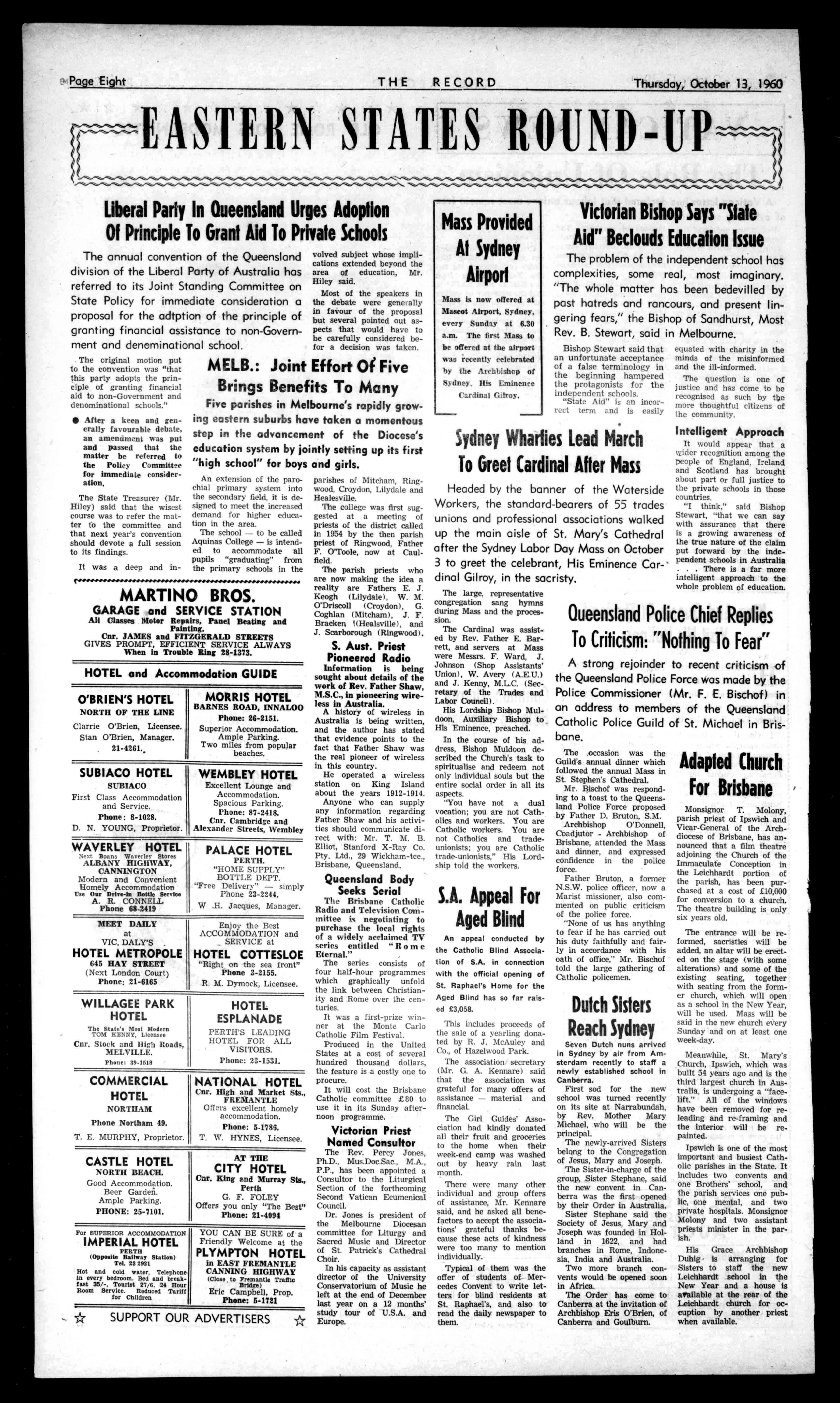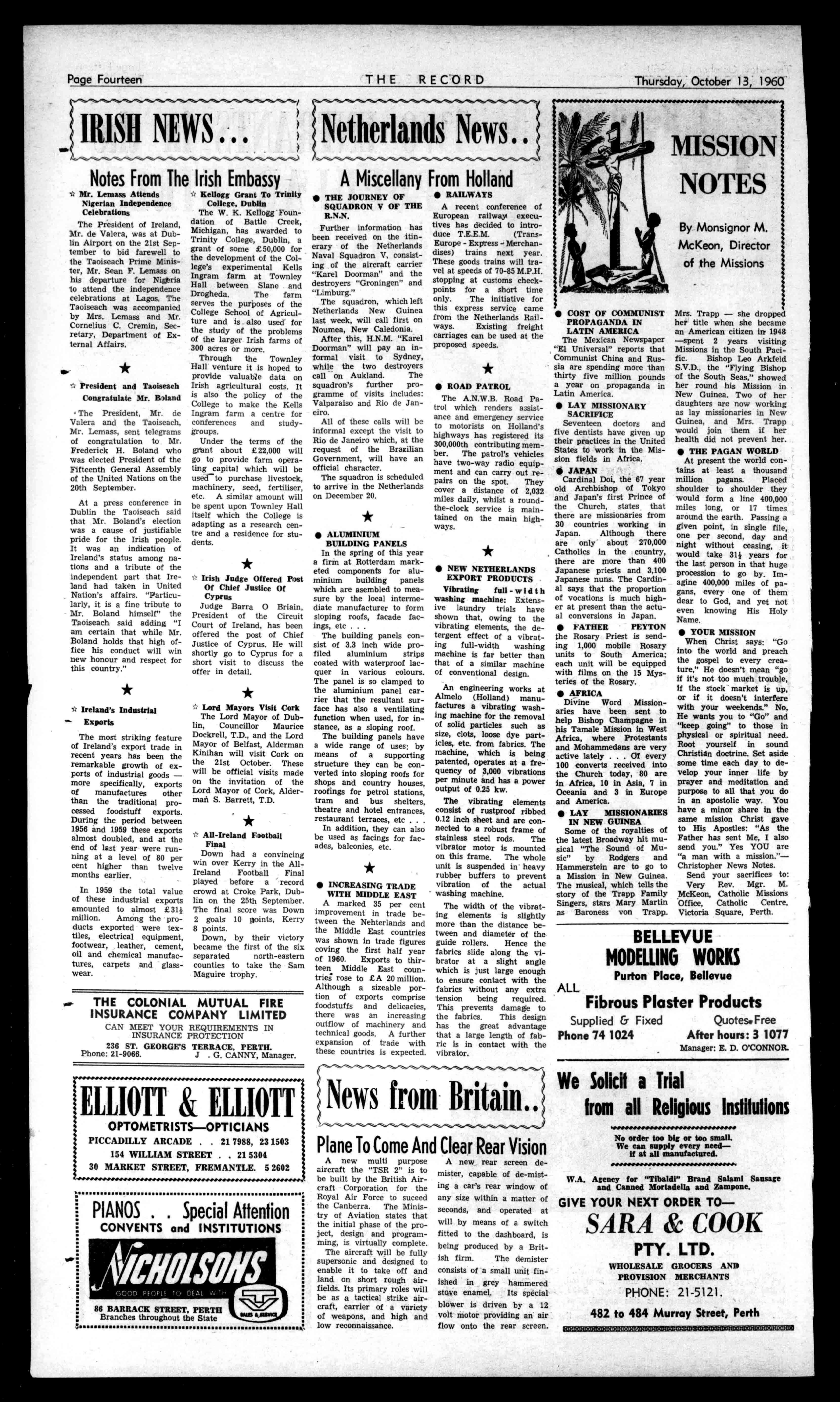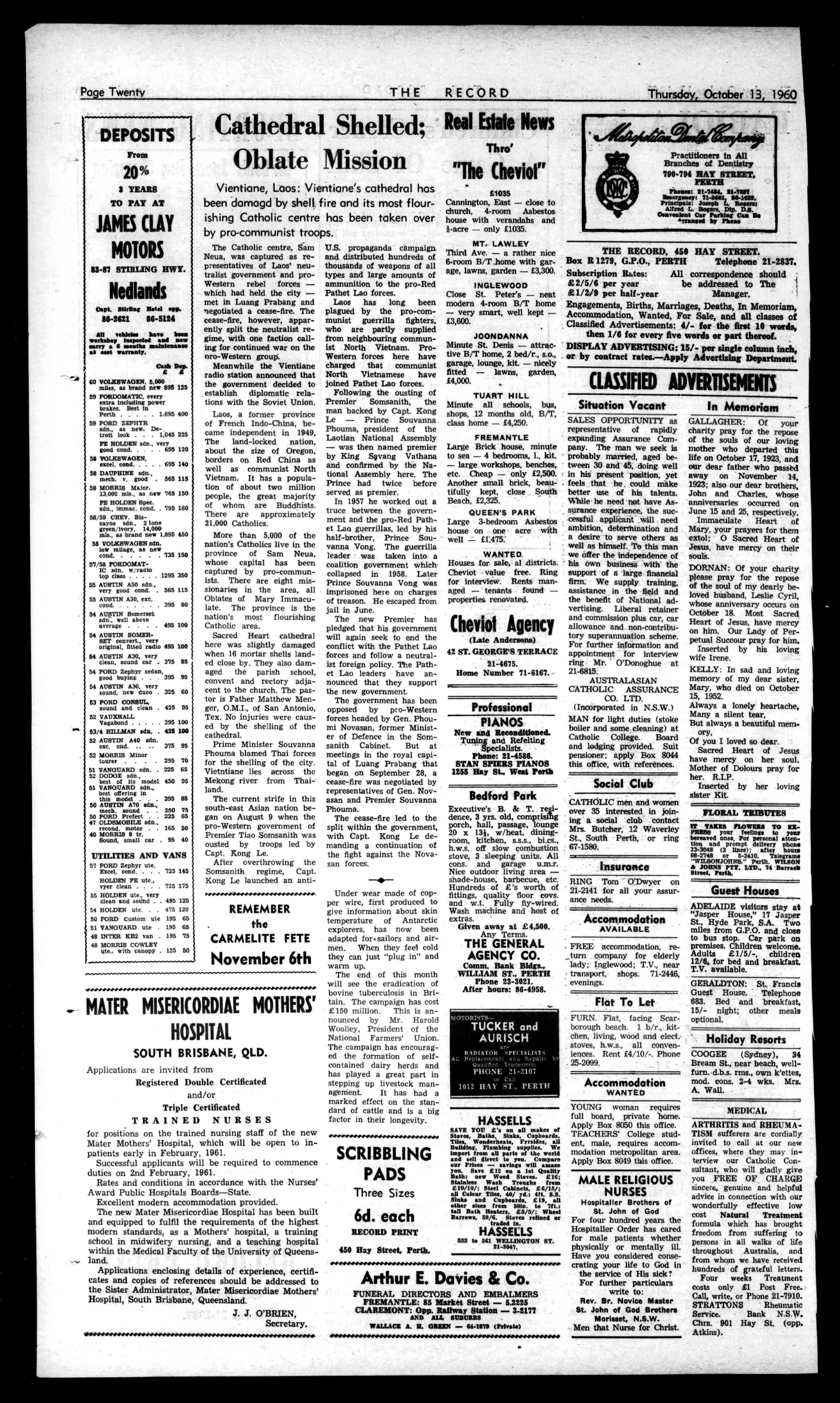outdoorlivingareashade-house,barbecue,etc. HundredsofL'sworthof fittings,qualityfloorcovs. andw.t.Fullyfly-wired. Washmachineandhostof extras. Givenawayat£4,500. AnyTerms. THEGENERAL AGENCYCO. Comm.BankBldgs., WILLIAMST.,PERTH Phone23-3021. Afterhours:86-4958. MOTORISTSTUCKERand AURISCH arc RADIATORSPECIALISTS Al:ReplacementsandRepairsby QualtfledTradesmen PHONE21-2107 orCal! 1012HAYST.,PERTH HASSELLS SAVEYOUE'sonallmakesof Storm,Baths,Sinks,Cupboards, Tiles,Wonderheats,Fyrsides,all Building,Plumbingenmities.We importfromallpartsoftheworld andselldirecttoyou.Compare ourPrices-saving.willamaze you.SaveEUonatatQuality Bath;newWoodStoves.£16: StainlessWashTroughsfrom E.10/10/:SteelCabinet.,E6/1S/; allColourTiles.40/yd.;Ott.8.0. Sink.andCupboards,E19,aU othersixestrans30in.to7ft.; tallBathHeater.,£5/51:Wheel Barrow,59/6.Stovesrelinedor tradedin. HASSELLS 553to561WELLINGTONST. 21-3047. ArthurE.Davies&Co. FUNERALDIRECTORSANDEMBALMERS FREMANTLE:85MarketStreet-5.2225 CLAREMONT:Opp.RailwayStation-3-2177 ANDALLMISUSES WALLACEA.H.OMEN-64-1878(Private) Thursday,October13,1960 PractitionersinAll BranchesofDentistry 790-794HAYSTREET. PERTH Phone.:11-7464,11-7117 Illmergeneyi71-1401.118-1889. Principals:JosephL.Roiliest AlfredL.Rogers,Dip.D.B. OsavornientCarParkingCanyrangedibyPb... THERECORD,458HAYSTREET. BoxR1279,G.P.O.,PERTH Telephone21-2837. SubscriptionRoutes: Allcorrespondenceshould £2/5/6peryear beaddressedtoThe £1/2/9perhalf-year Manager, Engagements,Births,Marriages,Deaths,InMemoriam, Accommodation,Wanted,ForSale,andallclassesof ClassifiedAdvertisements:4/-forthefirst10words, then1/6foreveryfivewordsorpartthereof. DISPLAYADVERTISING:15/-persinglecolumninch,
