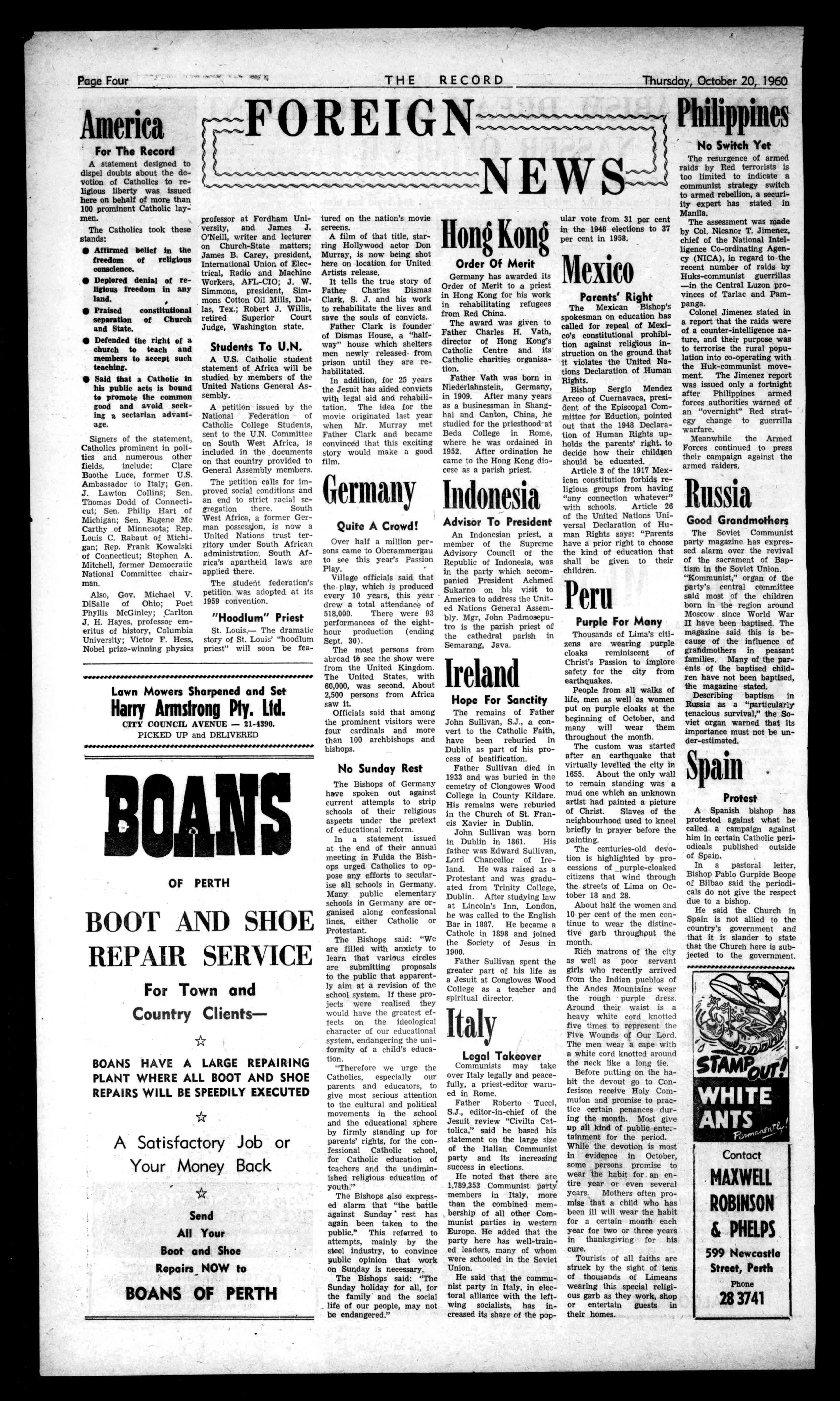 Master St.JohnofGodBrothers Morisset,N.S.W. MenthatNurseforChrist. HOTWATER atoufteetkark Utaditak_a4u4"1"e HASSELLS,WellingtonSt.,forall BRAEMARHotWaterSystems. WeInstallalsoTrade-In.1stqualityBaths,£25,all colours.AllmakesofStoves,Sinks,Cupboards,BuildingSuppliesf.'slessatHassell&Phone:21-3647. BYSEADIRECTTOSOUTHAMPTON,ROTTERDAM,BREMENHAVEN,m/v "AURELIA,"sailinon18/11/1960and28/1/1961from FREMANTLE,minimumfareUN1011,ortoGENOAper LLOYDTRIESTINO,FLOTTALAUROandCOGEDAR LINEVESSELS,faresfrom£A90andtothemainEuropean citiesbytrainatreducedrates.Forfulldetails,bookings, touristtripsandhotelreservationsinEuropeapplyto: ATLANTICSHIPPING-TravelAgency 2CANTONMENTSTREET,FREMANTLE. M.T.T.BusesFremantleTerminal.Phone5-31t1. "AlsoforallyourAIR,RAIL,PIONEERBUSESBOOKINGSwithinAUSTRALIAcontacttheATLANTIC TRAVELAGENCY." PractitionersinAll BranchesofDentistry 790-794HAYSTREET. PERTH Ptionorr21.7484,51-78E7 tmergeosyr71-2601,116-16118. Principals:JosephL.Roserol AlfredLRogersDtp.13.s. CoavoiatootCarParkingCowEs *TramielbyPlume THERECORD,450HAYSTREET. BoxR1279,G.P.O.,PERTH Telephone21-2837. SubscriptionRates: Allcorrespondenceshould £2/5/6peryear beaddressedtoThe £1/2/9perhalf-year Manager. Engagements,Births,Marriages,Deaths,InMemoriam, Accommodation,Wanted,ForSale,andallclassesof ClassifiedAdvertisements:4/-forthefirst10words, then1/6foreveryfivewordsorpartthereof. DISPLAYADVERTISING;15/-persinglecolumninch, orbycontractrates.-ApplyAdvertisingDepartment. CLASSIFIEDADVERTISEMENTS Deaths ALLEN(Marguerite):Passedtohereternallifeon October14th. Beloved wifeofGeorge,motherof Beres(Mrs.K.Jones), Peter(SouthAustralia)and Pauline.Dearsisterof Eileen(MotherFrancisRegiv,LoretoConvent,Brisbane)Cathleen,