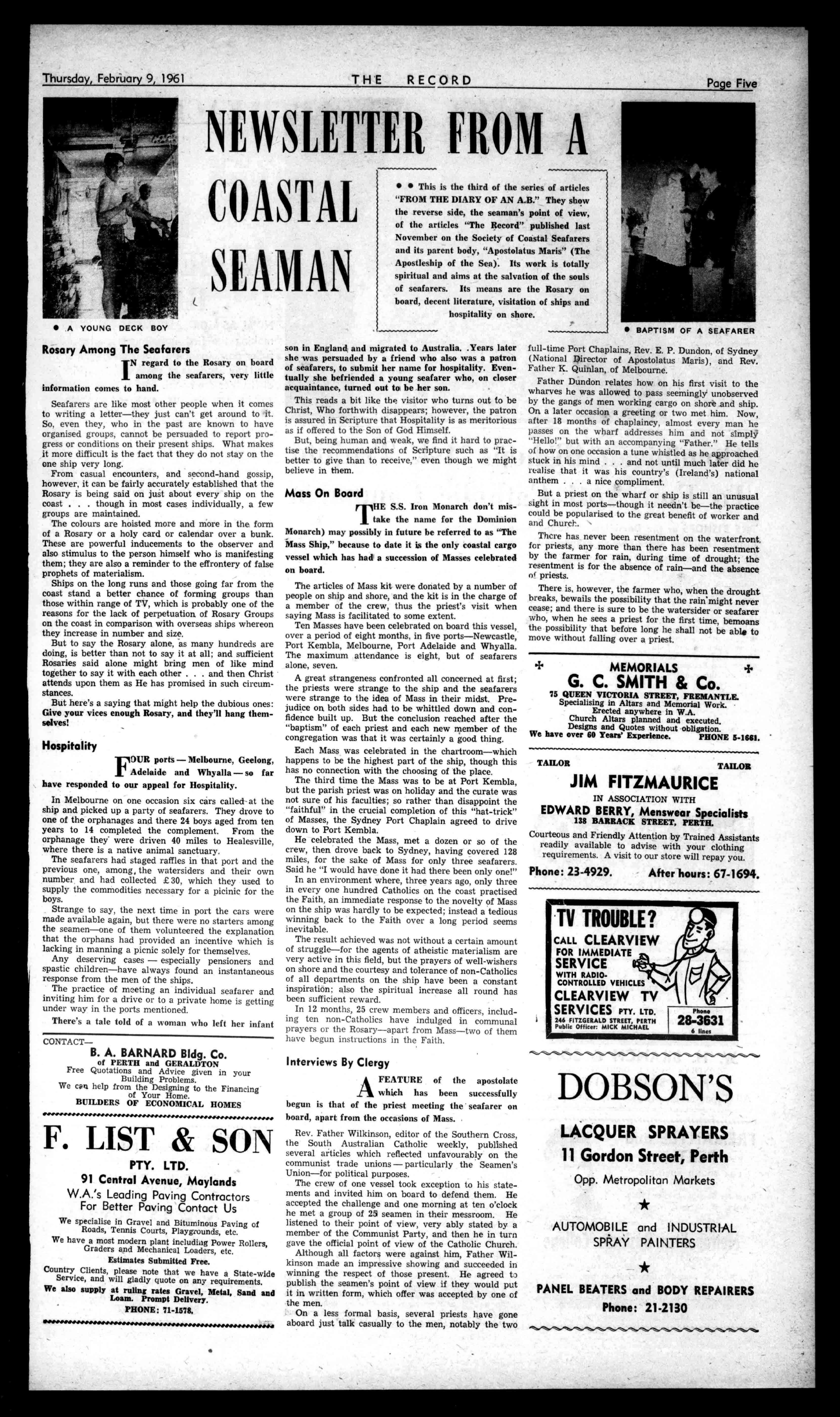 Park,S.A.Two milesfromG.P.O.andclose tobusstop.Carparkon premises.Childrenwelcome. Adults£1/5/-,children 12/6,forbedand breakfast. T.V.available. Insurance FORallyourinsurance needs,W.(Wally)Omodei, yourA.C.A.(Australian CatholicAssurance)representative.Ring71-3328or 21-6815anytime. HOTWATER atotowNedock Utaeo;ta/t444(41"1 HASSELLS,WellingtonSt.,forall BRAEMARHotWaterSystems WeInstallalsoTrade-In.1stqualityBaths,£19,all colours.AllmakesofStoves,Sinks,Cupboards,BuildingSuppliesUslessatHassells.Phone21-3047. PractitionersInAll BranchesofDentistry 790-794HAYSTREET, PERTH Phones,21-7484.51.7587 Emergency:71-1601,86-16111. Principal,JosephL.Roger.; AlfredL.Roger..Dip.D.S. C lentCarParkingCanNi ,..ransadbyMums THERECORD,450HAYSTREET. BoxR1279,G.P.O.,PERTH Telephone21-2837. SubscriptionRates: Allcorrespondenceshould £2/5/6peryear beaddressedtoThe E1/2/9perhalf-year Manager. Engagements,Births,Marriages,Deaths,InMemoriam, Accommodation,Wanted,ForSale,andallclassesof ClassifiedAdvertisements:4/-forthefirst10words, then1/6foreveryfivewordsorpartthereof. DISPLAYADVERTISING:15/-persinglecolumninch, orbycontractrates.-ApplyAdvertisingDepartment. CLASSIFIEDADVERTISEMENTS Accommodation AVAILABLE YOUNGGirlwantedto shareflat.Apply17Dean Street,Cottesloe. FULLBoardfortwostudents,suitfriends,close beach,transport,withyoung family,niceroom.68RailwayStreet,Cottesloe. Accommodation WANTED FURNISHEDHouse,4bedrooms,vicinityCityand EastPerth.ApplyJ.Lee.