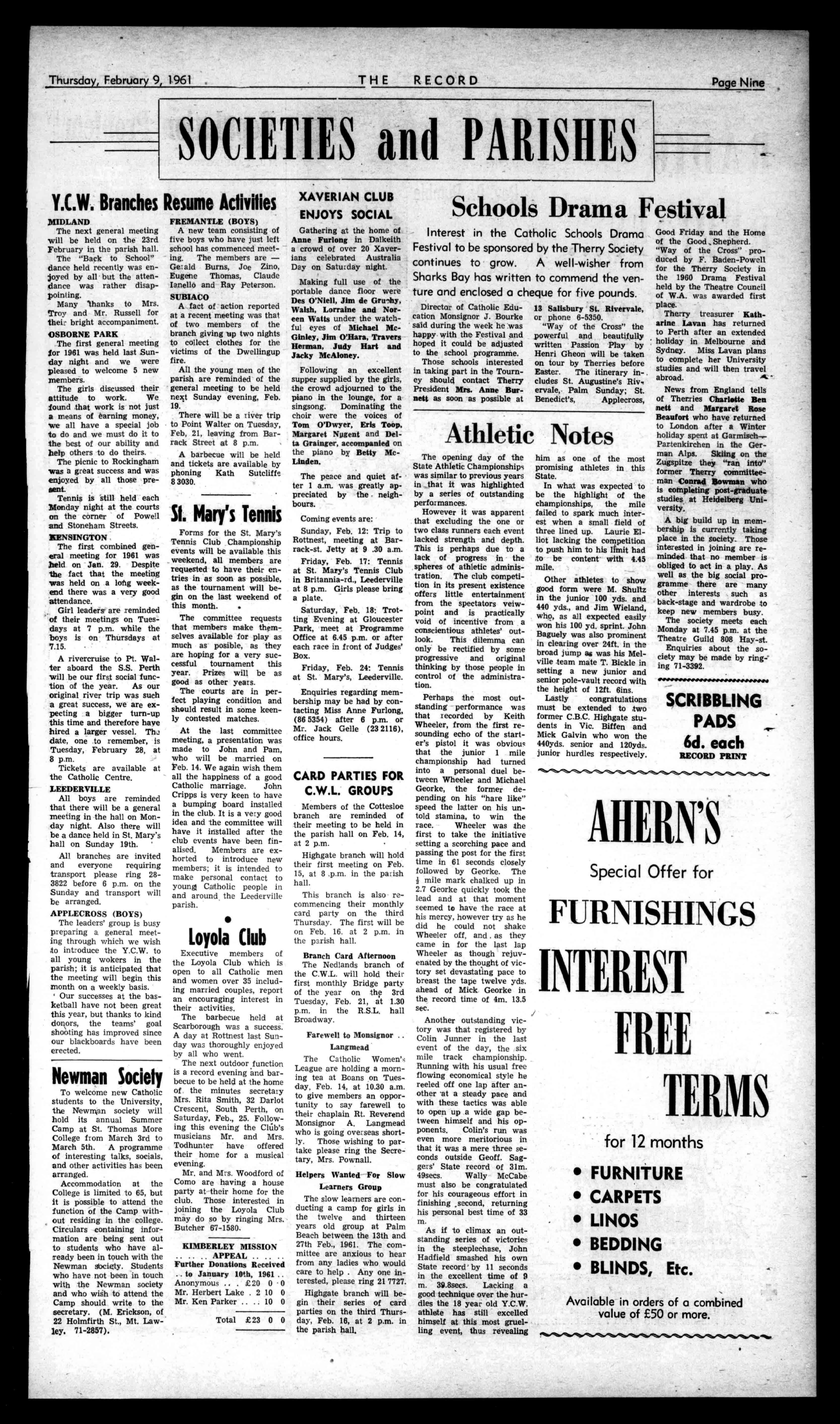 20%REDUCTIONonSupersededRacquets SlazengersChallenge,209'6-Reducedto167/6(Gut) SlazengersGarrick,165- -Reducedto132/6(Gut) SpaldingsGonzales,2096-Reducedto167/6(Gut) SpaldingsGoldMedal165/.-Reducedto132/6(Gut) AlexanderCressy,209'6- Reducedto159/6(Gut) AlexanderTopSpin,185,-Reducedto139/6(Gut) OliverJnr.,79/9 Reducedto63/6(Gut) WIMBLEDONSPORTSDEPOT 14DAVIDJONESARCADE,PERTH (N.D.Keast-J.V.E.Roast Tel.:23-4219. OfficialDepotforW.A.CatholicLawnTennisAssoc. 0000 041I41sts0040111t03011/1114 ST.PAUL'S"C"CLASSHOSPITAL Anewconvalescenthomeforladies,withall ModernConveniences OpeningDate:18thFebruary Cr.DOONGALLAST.&ORMONDRD.,ATTADALE PeacefulSurroundings-RiverViews Enquiries:Ring252314 SISTERV.G.FITZGERALD (040*000 7ua1 AMRIlw1,473 ABSOLUTELYSILENT VENTILATIONPOSITIVE ANDFREE PATENT"S"ROTOR VENTILATORS No1.-t,trkDraught:SeveralSizes-SuppliedcompletewithAdaptorswhere requiredforfittingto "Fibrolite"Upstands. SoleW.A.Agent' IANBONNERUP ROOFandFLOORSERVICE 18-20NorthwoodStreet, WestLeederville. 8-1082-8-1082 SEVENHILLSALTARWINES AsSevenHills'SacramentalWineismadebyJesuits itcomplieswiththerequirementsofChurchLaw. WESTRALWINEandSPIRITAGENCY 167HAYSTREET,SUBIACO.Phone8-1410. SERVICEPRINTINGCO.PTY.LTD. MODERNPACKAGING - CARTONS LABELS-LETTERPRESS-OFFSET 219931 4 ;/7-0 ADSCOTT '