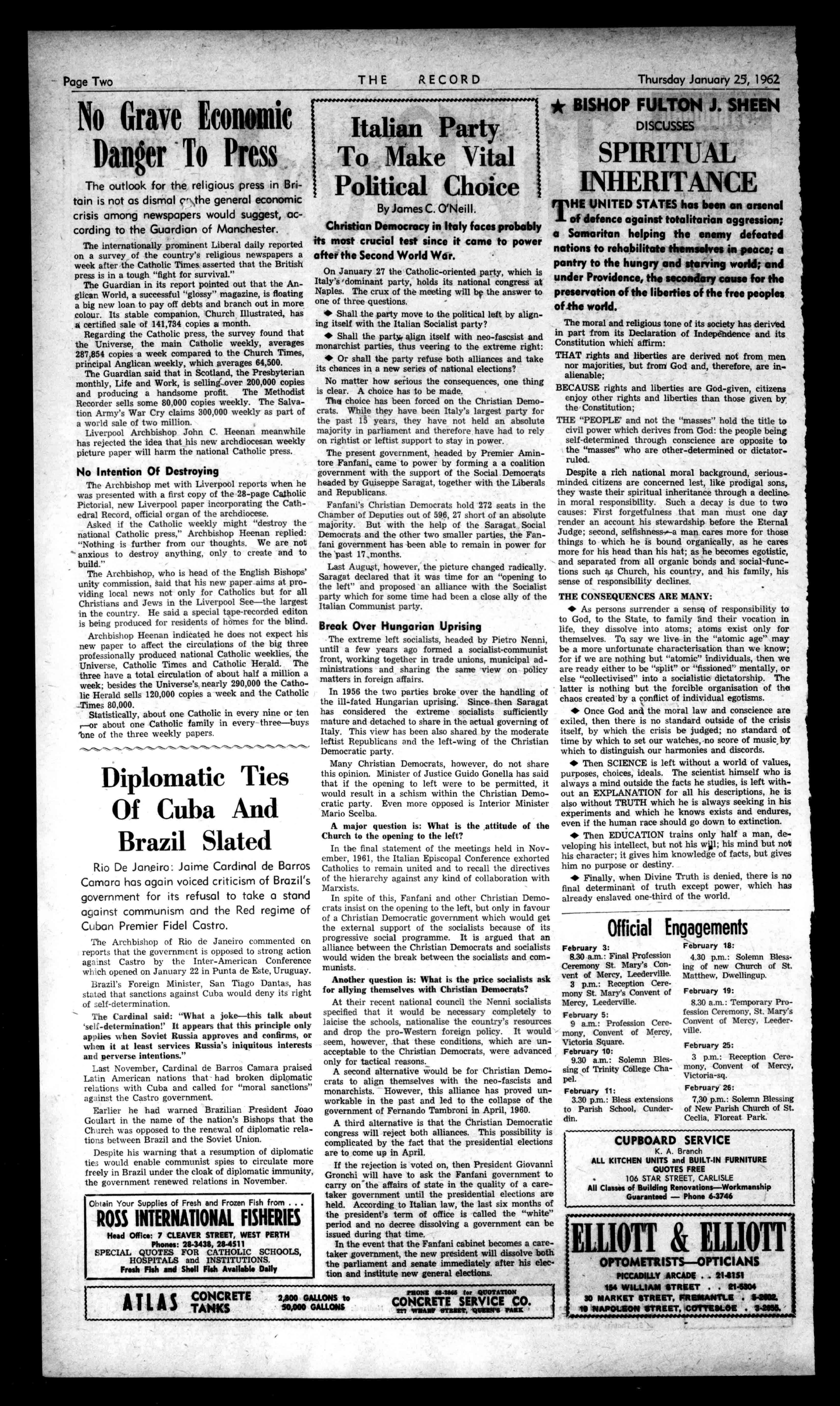 TheArchbishopmetwithLiverpoolreportswhenhe waspresentedwithafirstcopyofthe28-pageCatholic Pictorial,newLiverpoolpaperincorporatingtheCathedralRecord,officialorganofthearchdiocese.