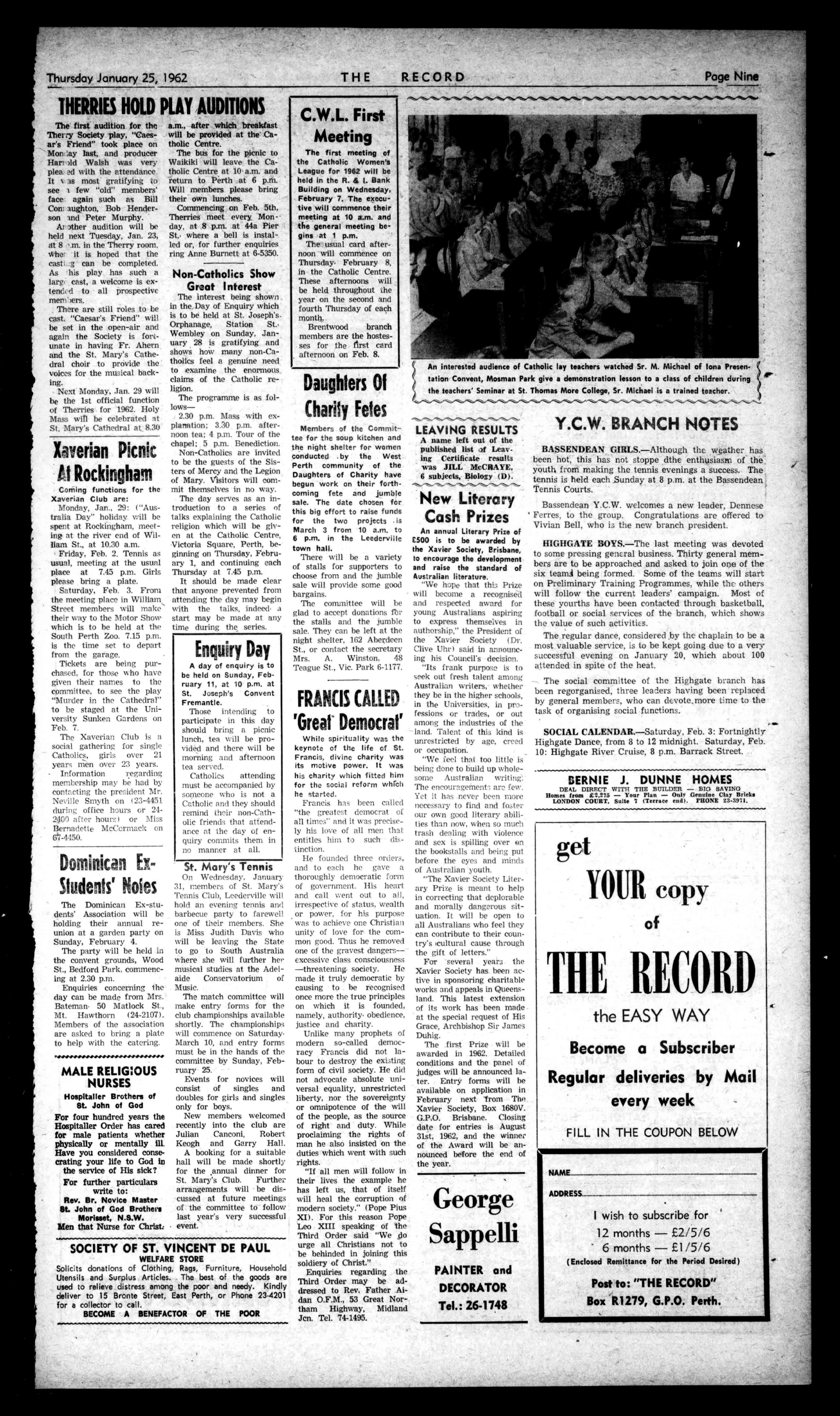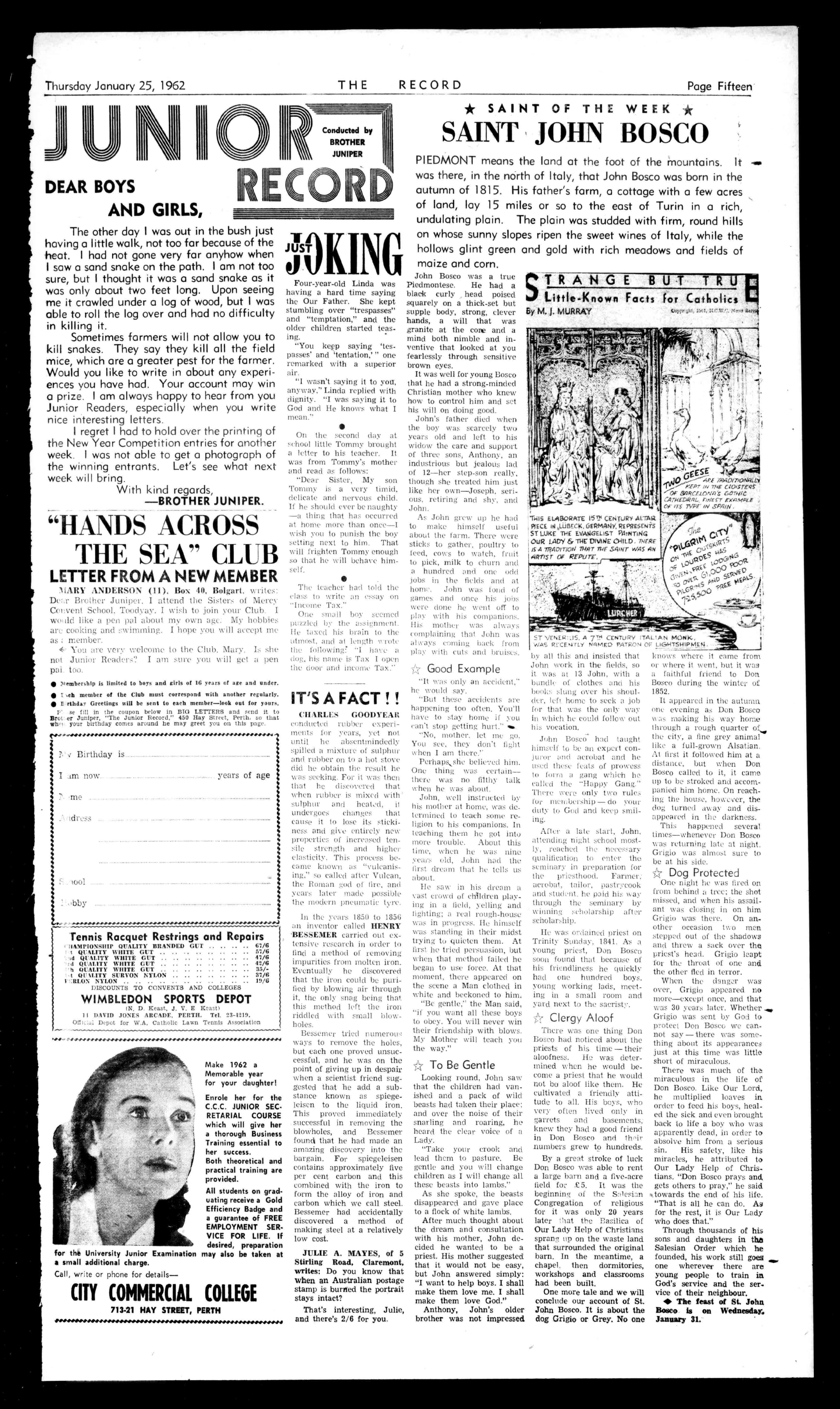 islimitedtoboysandgirlsof16yearsofageandunder. .ehmemberoftheClubmustcorrespondwithanotherregularly. trihdayGreetingswillbesenttoeachmember-lookoutforyour, sefillinthecouponbelowinBIGLETTERSandFenditto Bros.el.Juniper,TheJuniorRecord,"450HayStreet,Perth,sothat wh,yourbirthdaycomesaroundhemaygreetyouonthispage, co............wwww.i.MmormiNhov Birthdayis I.imnow me di,, .41,tool 'bby yearsofage TennisRacquetRestringsandRepairs 1147V1PIONSIIIPQUALITYBRANDEDGUT 61/6 QUALITYWHITEOTT 51/6 Qt%LITTWHITEGUT 47/6 QtALITYWHITEGUT 47/6 QUALITYWHITEGUT 35/Qt%LITTSURVONNYLON 37/6 RIAINNYLON 19/6 DISCOUNTSTOCONVENTSANDCOLLEGES WIMBLEDONSPORTSDEPOT IN.D.Keast,J.V. 11DAVIDJONESARCADE.PERTH.Tel.23-4010. 0111......;DepotforW.A.CatholicLawnTennisAssociation fortheUniversityJuniorExamination asmalladditionalcharge. Call,writeorphonefordetailsMake1962a Memorableyear foryourdaughter! Enroleherforthe C.C.C.JUNIORSECRETARIALCOURSE whichwillgiveher athoroughBusiness Trainingessentialto hersuccess. Boththeoreticaland practicaltrainingare provided. AllstudentsongraduatingreceiveaGold EfficiencyBadgeand aguaranteeofFREE EMPLOYMENTSERVICEFORLIFE.IF desired,preparation mayalsobetakenat CITYCOMMERCIALCOLLEGE 713-21HAYSTREET,PERTH