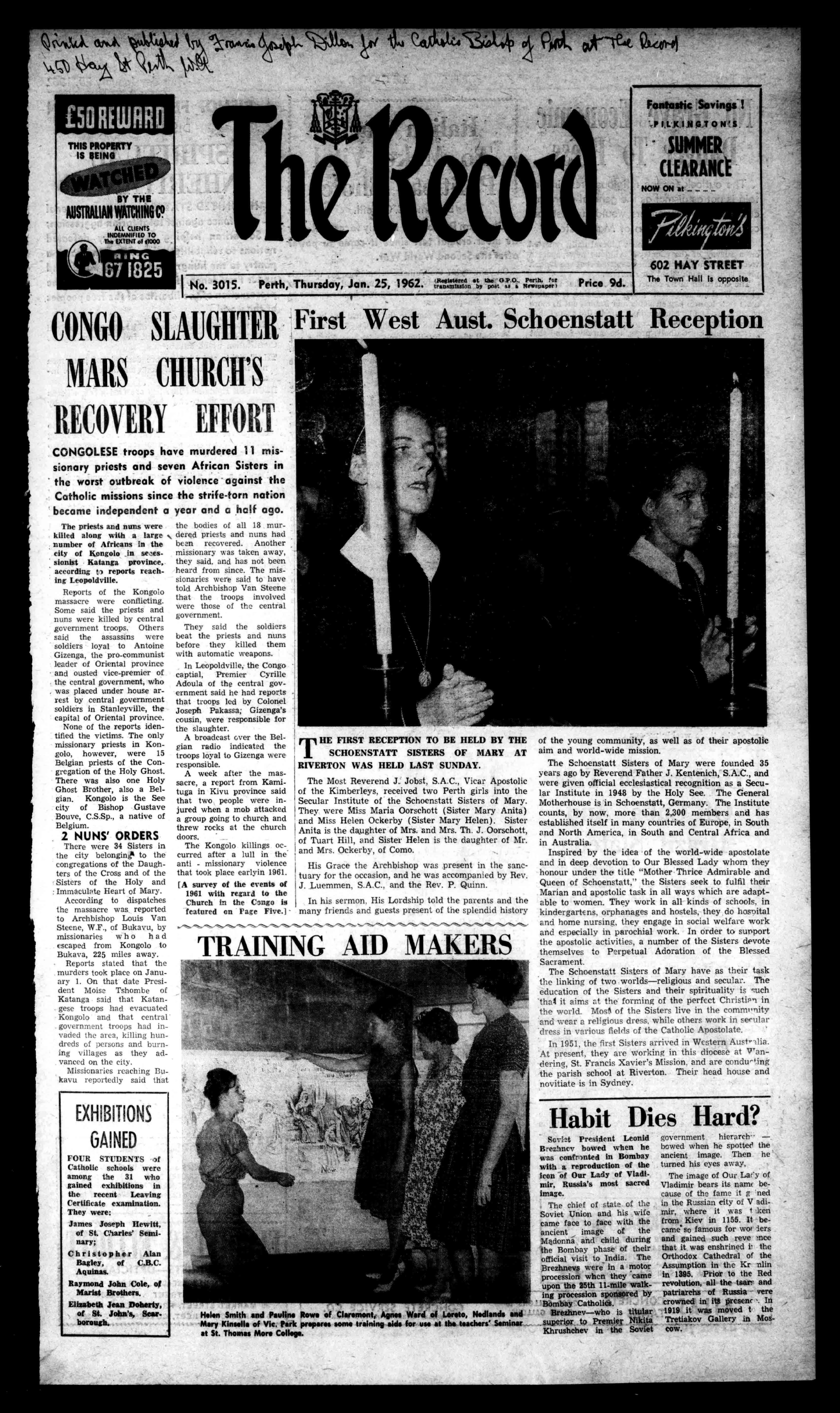 In1951,thefirstSistersarrivedinWesternAust-ilia. Atpresent,theyareworkinginthisdioceseatWandering,St.FrancisXavier'sMission.andareconducting theparishschoolatRiverton.Theirheadhouseand novitiateisinSydney.