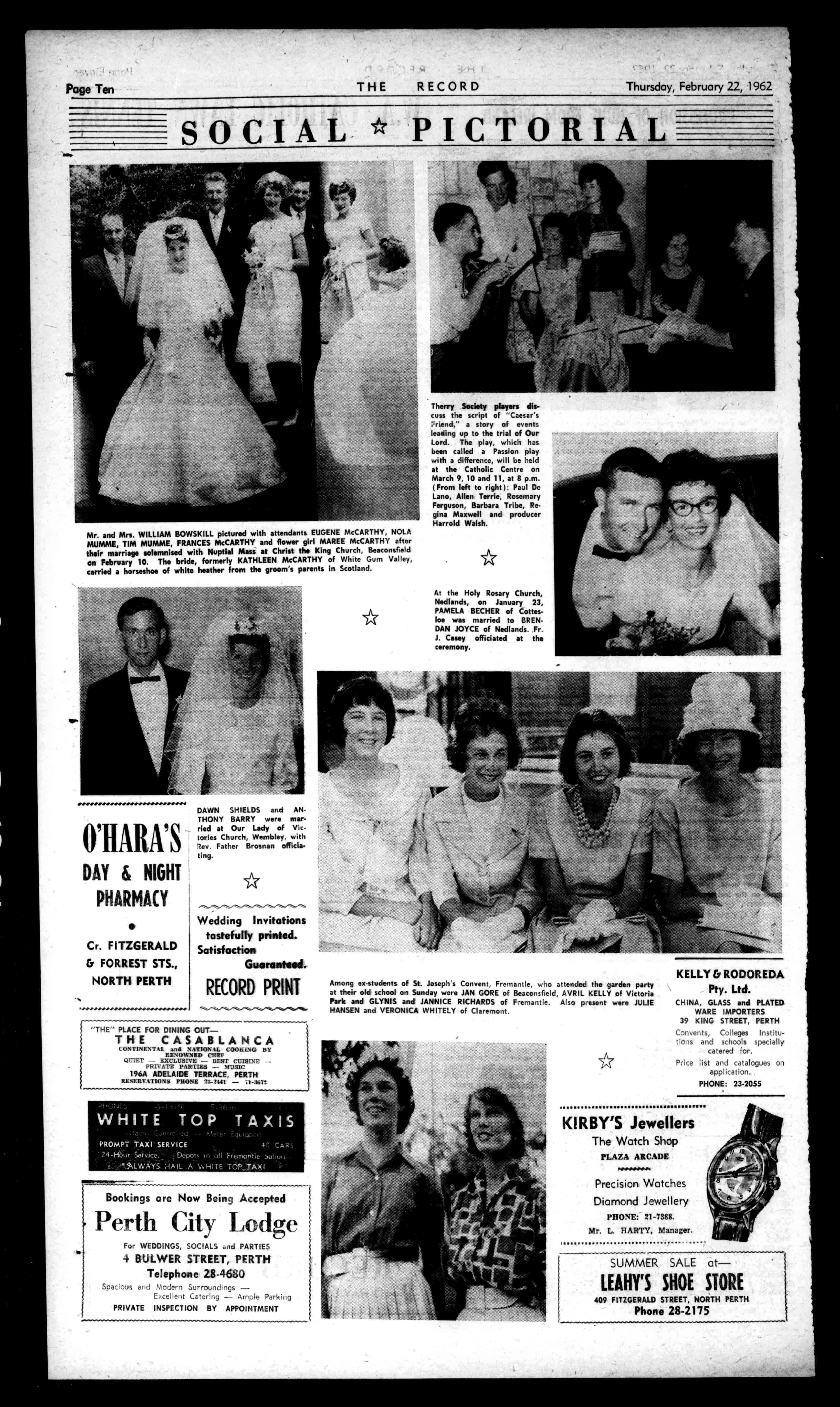 Stainless WashTroughs,£12/15/-.Iron grillebronzewireDoorsonly95/-. StovesrelinedInhalfaclayor tradedInonMettersEVERHOT andallmakesWood.Gas,Electric Stoves.BuildingandPlumbing suppliesL'sless. HASSELLS 553WellingtonSt..2I-6307. JASPERMOTEL S.A. Latestair-condltionedbedrooms,privatebathroomand tollet.FullMotefacilities havebeenaddedtothe hospitalityat JASPERGUESTHOUSE 17JASPERST.,HYDEPARK ADELAIDE,S.A.71-7556. BedandBreakfastTariff: Motel:95/-,20/-. GuestHon,:25/-,12/6. Mon.! TUCKERand AURISCH -et: , AnRealm, Qua; PHONE21-2107 1017HAYST.,PERTH EUROPEANNIGHTCLUBRESTAURANT FULLYAIR-CONDITIONED DancingandEntertainmentNightly 27LAKESTREET,PERTH-23-1589 PRIVATEROOMFORPARTIES-WESPECIALISEIN"MEALS TOTAKEAWAY."RingandOrder. WEDDINOsandPARTIESONSUNDAYS. PractitionersInAll BranchesofDentistry 790-794HAYSTREET, PERTH Phone.:11-74114,11-7157 Emergency:71-1601,86-1619. Principals:JosephL.Rogers; AlfredL,Rogers,Dip.DS. Conover:dentCarParkingCan ArrangedbyPhone THERECORD,450HAYSTREET. BoxR1279,G.P.O.,PERTH. Telephone21-2837. SubscriptionRates: Allcorrespondenceshould £2/5/6peryear beaddressedtoThe £112/9perhalf-year Manager. Engagements,Births,Marriages,Deaths,InMemoriam, Accommodation,Wanted,ForSale,andallclassesof ClassifiedAdvertisements:4/-forthefirst10words, then1/6foreveryfivewordsorpartthereof. DISPLAYADVERTISING:15/-persinglecolumninch, orbycontractrates.-ApplyAdvertisingDepartment.