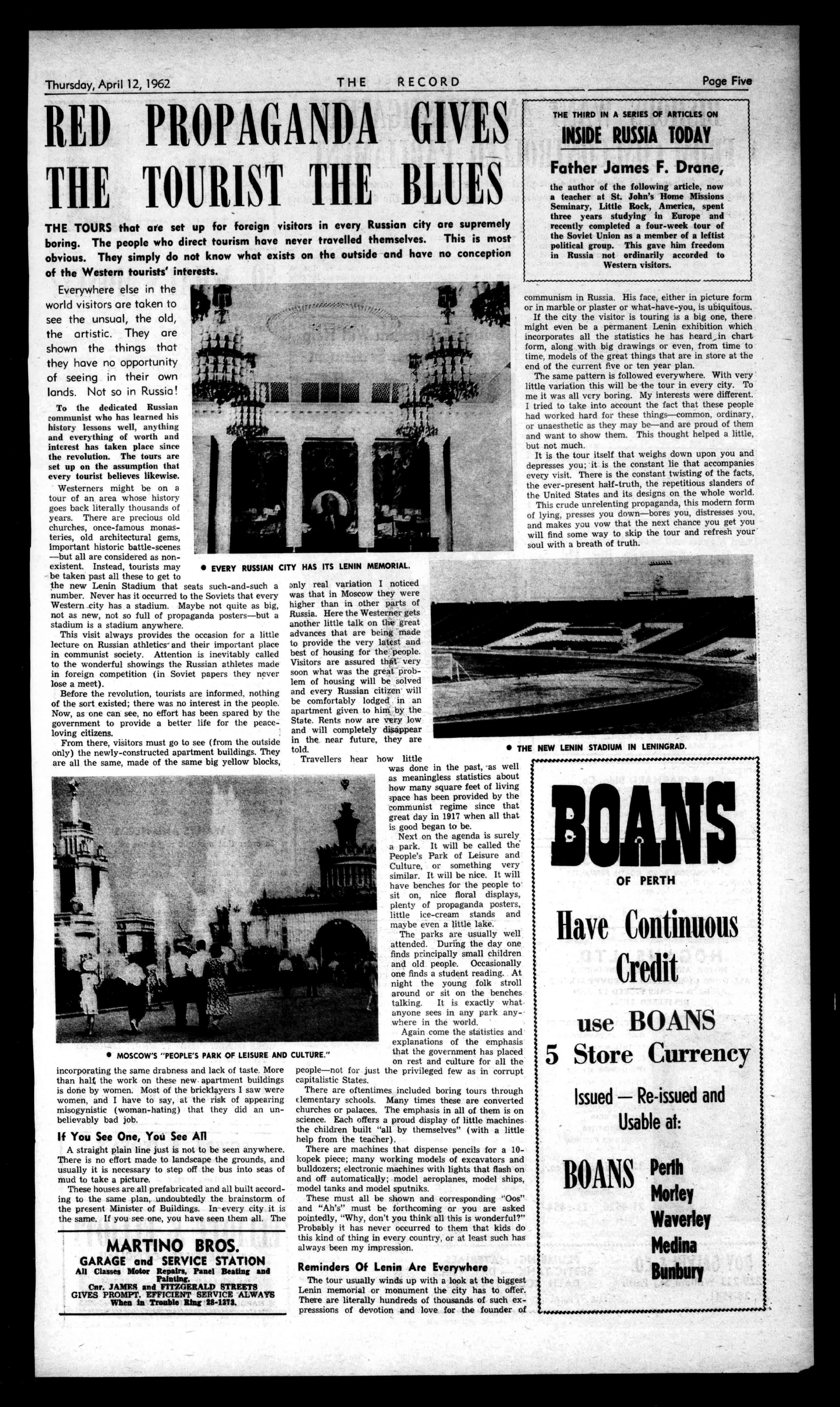 Visitors.-Bed andbreakfast;central,quiet homelysurroundings;motel room35/-,guestroom25/adults;childrenreduced rates.-WriteJasperMotel andGuestHouse,17Jasper Street,HydePark,S.A. MELBOURNEEast,119 GreyStreet,B/B,18/6. Modernamenities.Nice Home.Beautifullocality, nearCathedral. WANTED BLOCKS ClaremonttoNorthBeach Promptcashsettlement Ringallhours 87-1820 LeedervilleEstateAgency, 14MarlowStreet, WEMBLEY A CATHOLICPAPER IN EVERYHOME EUROPEANNIGHTCLUBRESTAURANT FULLYAIR-CONDITIONED DancingandEntertainmentNightly 27LAKESTREET,PERTH-23-1589 11111-ATEROOMFORPARTIES-WESPECIALISEIN"MEALS TOTAKEAWAY,"RingandOrder. WEDDINGSandPARTIESONSUNDAYS. PractitionersInAlt BranchesofDentistry 790-794HAYSTREET, PERTH Phone.:21-74614,81-71137 Emergeney.71-1401,114-1139. Principals:JosephL.Rogers; AlfredL.Rogers,Dip.D.8. °mossiestCarParkingCastSe Arranged17rheas THERECORD,450HAYSTREET. BoxR1279,G.P.O.,PERTH. Telephone21-2837. SubscriptionRates: Allcorrespondenceshould £2/5/6peryear beaddressedtoThe £1/2/9perhalf-year Manager. Engagements,Births,Marriages,Deaths,InMemoriam, Accommodation,Wanted,ForSale,andallclassesof ClassifiedAdvertisements:4/-forthefirst10words, then1/6foreveryfivewordsorpartthereof. DISPLAYADVERTISING:15/-persinglecolumninch, orbycontractrates.-ApplyAdvertisingDepartment. CLASSIFIEDADVERTISEMENTS InMemoriam Deaths