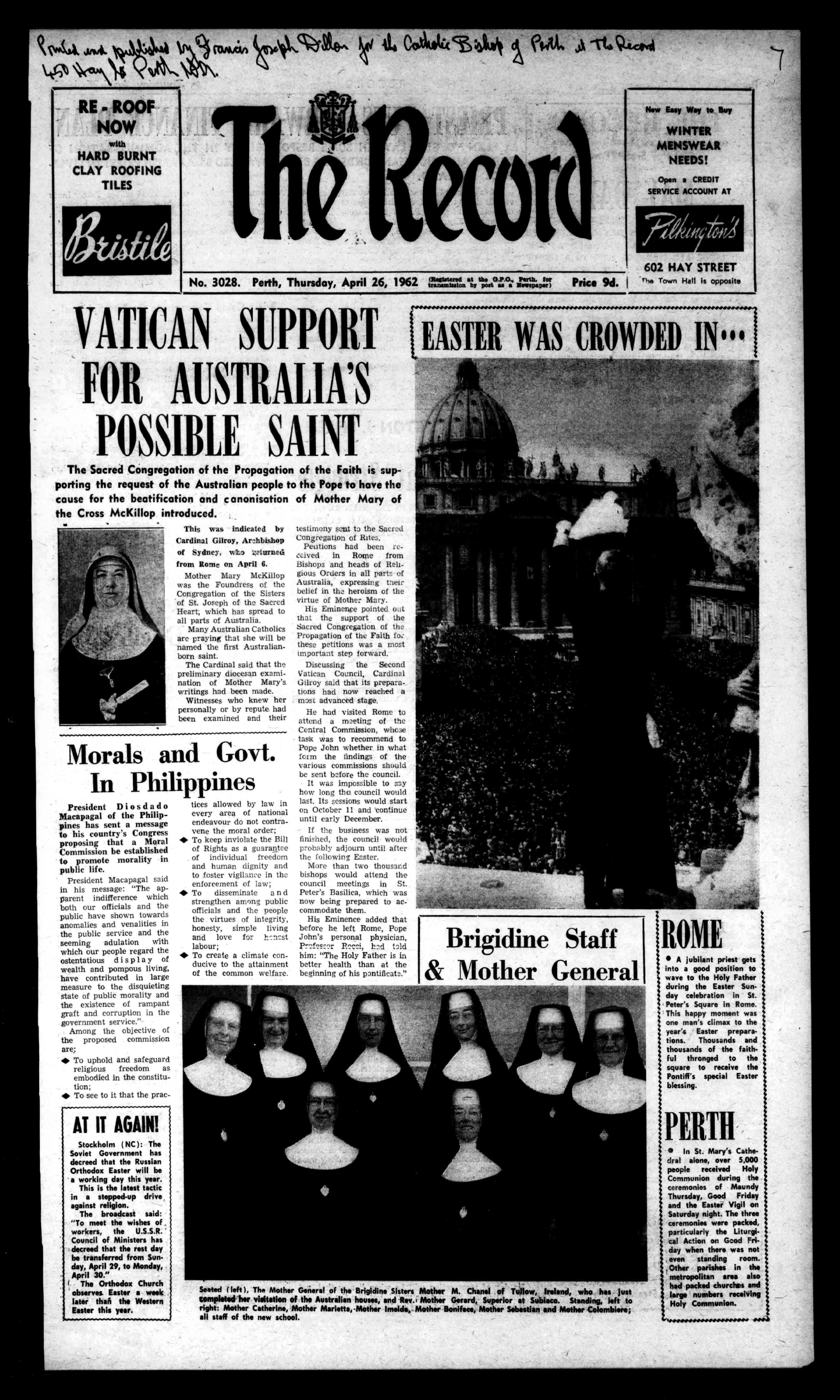testimonysenttotheSacred CongregationofRites. Petitionshadbeenrei:civedinRomefrom BishopsandheadsofReligiousOrdersinallpartsof Australia,expressingtheir beliefintheheroismofthe virtueofMotherMary.