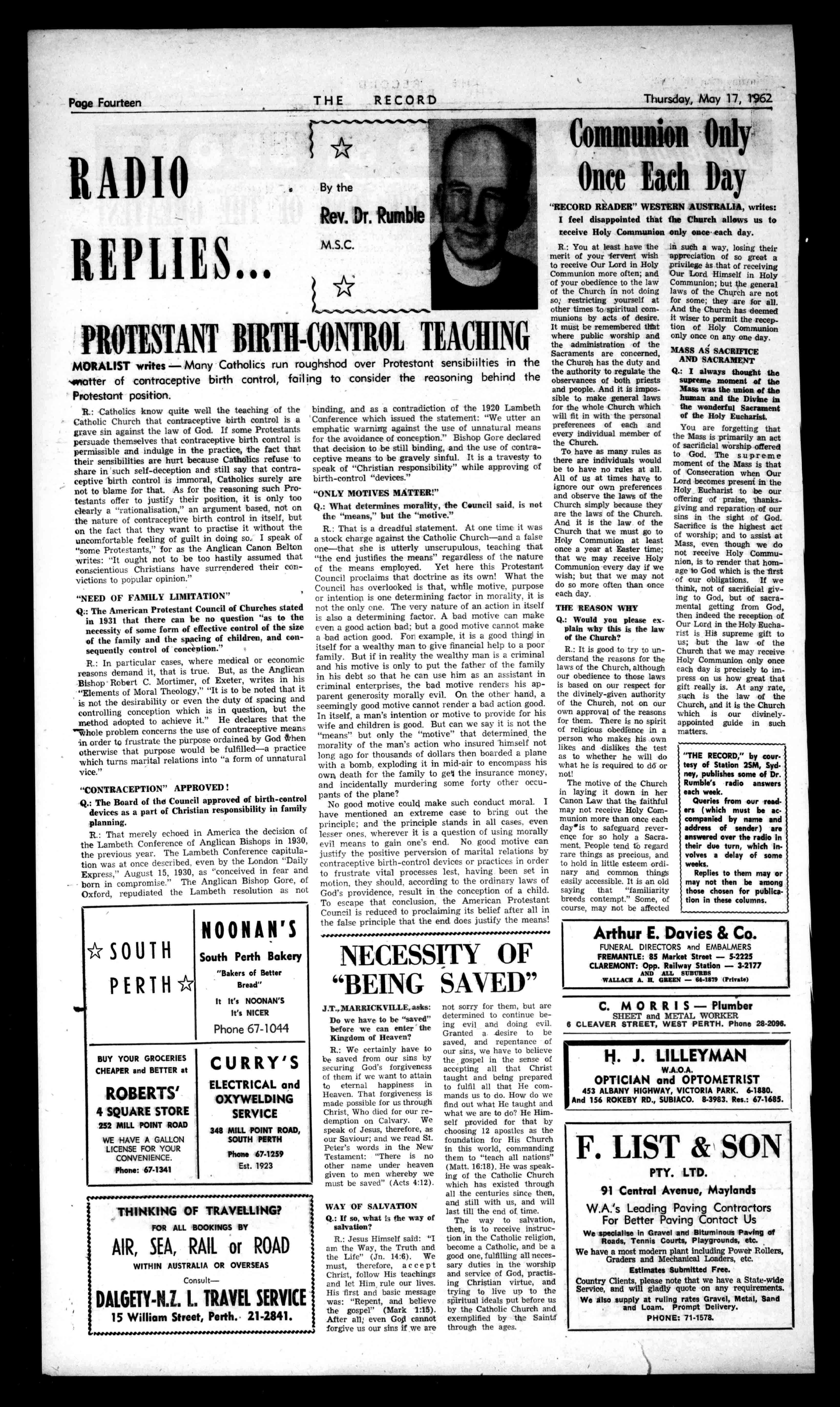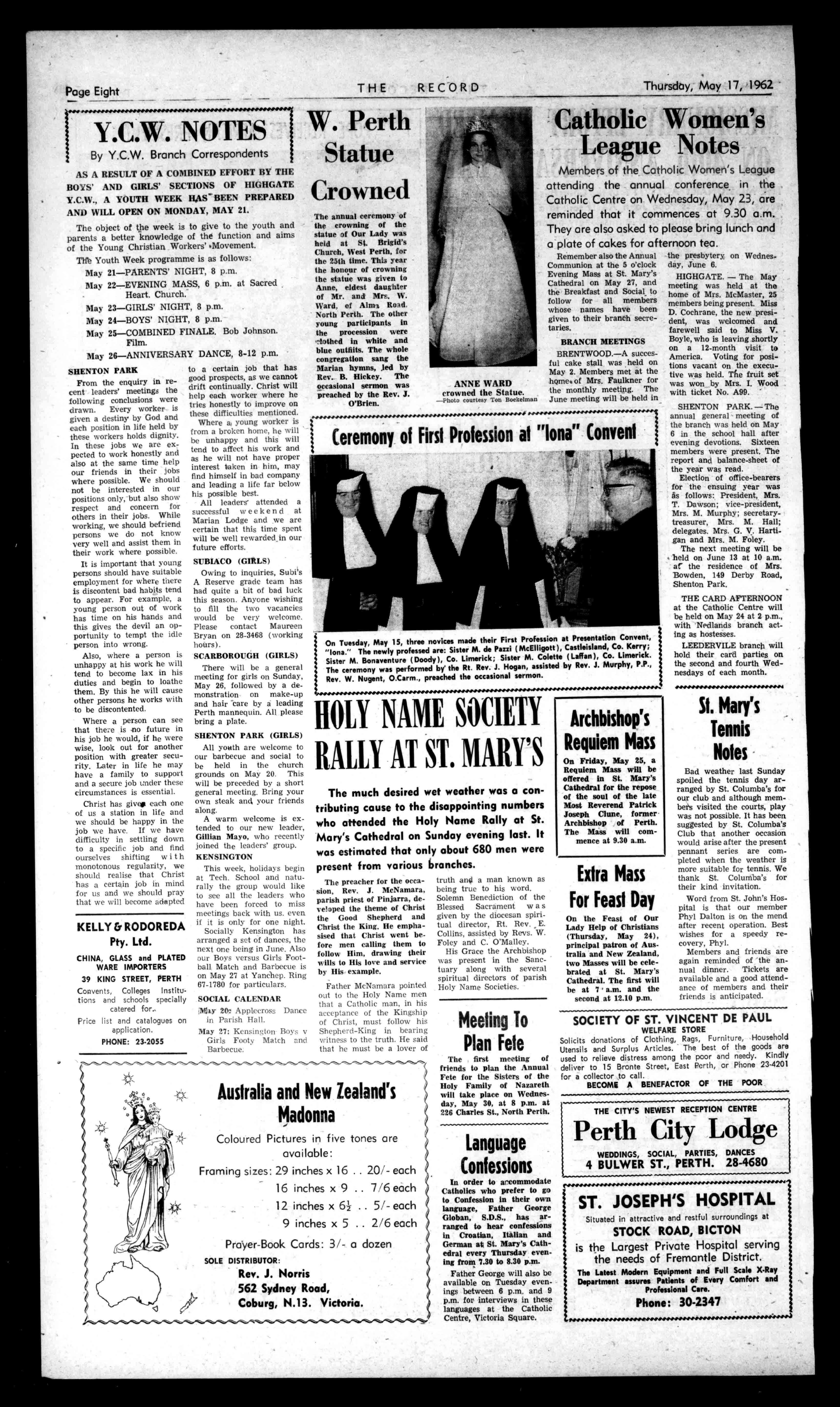 WANTED HomesNearTheChurch AllDistricts ToRentAndToBuy CONTACT CheviotAgency 42ST.GEORGE'STERRACE. Phone21-4675. AfterHours:71-6167 HASSELLSAMAZINGBARGAINS Upto£30trade-inonwoodor anytypestoveallowed.Besure tocompareourpricesforallmakes wood,gas,electricstoves.fridge, washingmachines.1stQuality ColouredAcidResistingLifetime BATHSonly£19.Imported6x8 WallThesfrom29/-yd.Largest stocksofBathe.Stoves,Sinks, Cupboards, In W.A.StainlessSteel Sinks,3ft.towt.sizes.Stainless WashTroughs,£12/15/-.Iron grillebronzewireDoorsonly95/-. Stovesrelinedinhalfadayor tradedinonMettersEVERHOT andallmakesWood,Gas,Electric Stoves.BuildingandPlumbing suppliesL.'slea'. HASSELLS 553WellingtonSt..21-6307. MELVILLE-ALFREDCOVE BrandnewBrick/Tile3bedroomHome,lounge,dining room,kitchen,h.w.s.,tiled bath,s/recess. Closeschool,transport,shops. OutstandingValueat £4,400 Threeothersincourseof erection. KevinF.Doyle 8CO. 2ELIRRAST.,PALMYRA 39-1832-AllHours PrintedandpublishedbyFrancis' JosephDillon,"TheRecord"office, 450Hay-st.,Perth. StreetNameFor PaulineJaricot InFrance.theLyonscity councilhasvotedtochange thenameofastreetto honourPauline