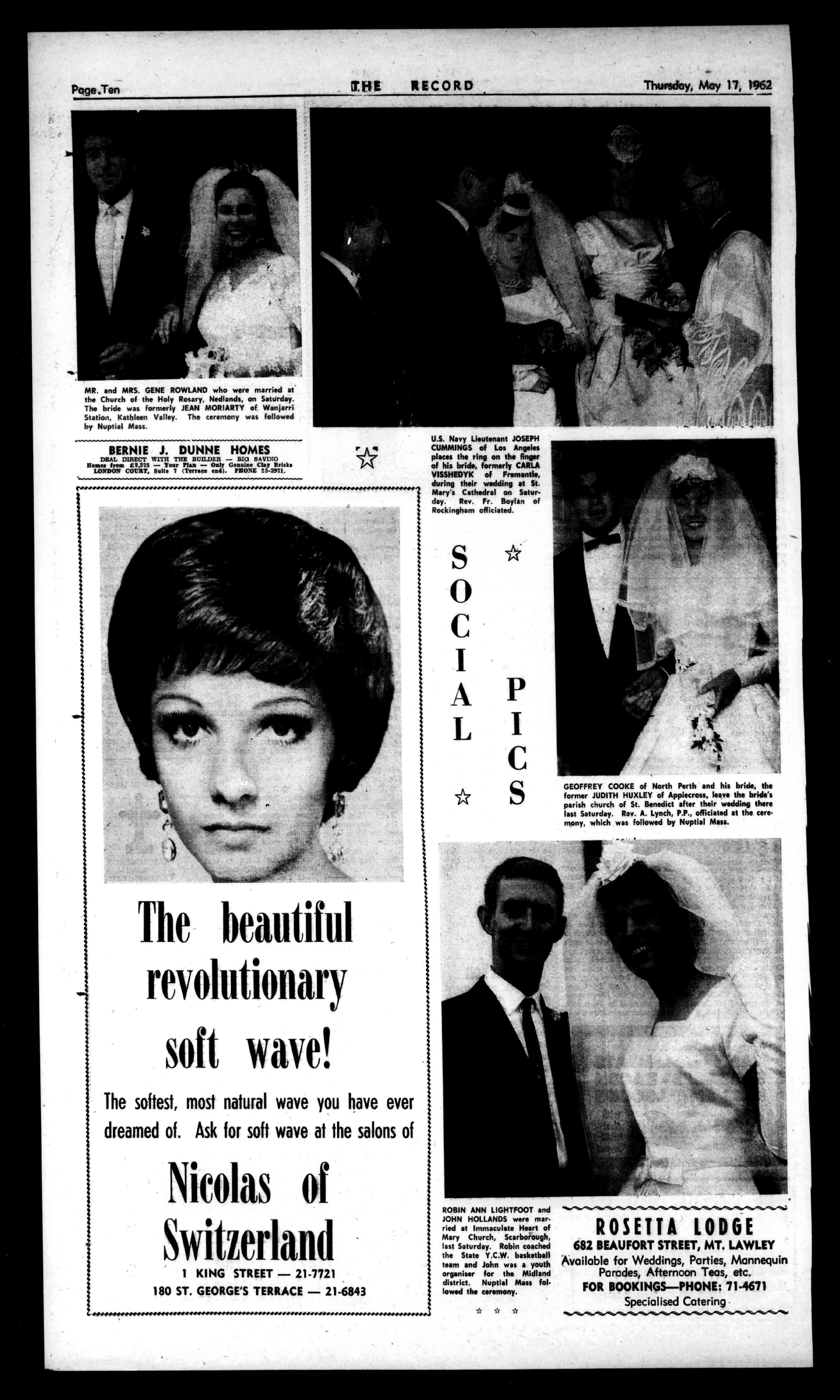 PractitionersinAll BranchesofDentistry 790-794HAYSTREET, PERTH Phoney21-7484,11-7887 Easergeneyt71-2601,86-1639. Principal.:JosephL.Rogers: AlfredL.Rogers,Dip.D.B. ConvenientCarParkingCamIle Arran'sSc.Cheer THERECORD,450HAYSTREET. BoxR1279,G.P.O.,PERTH. Telephone21-2337. SubscriptionRates: A1.1correspondenceshould £215/6peryear beaddressedtoThe x£112/9perhalf-year Manager. Engagements,Births,Marriages,Deaths,InMemoriam, Accommodation,Wanted,ForSale,andallclasseof ClassifiedAdvertisements:4/-forthefirst10words, then1/6foreveryfivewordsorpartthereof. DISPLAYADVERTISING:15/-persinglecolumnilch, orbycontractrates.-ApplyAdvertisingDepartment. TUCKERand AURISCH It11.11, ICI-tom PHONE21.2107 orCall 1017HAYST.,PERTH CLASSIFIEDADVERTISEMENTS InMemoriam HICKEY:Ofyourcharity prayforthereposeofthe soulofJohnLaurence Hickey,theanniversaryof whosedeathoccursonMay 18. Eternalrestgrantuntohim, 0Lord,andletPerpetual Lightshineuponhim. McDERMOTT(Archie):In dearmemoryofmyloving husband,whopassedinto God'ssafekeepingonMay 19,1961.-Mollie. FLORALTRIBUTES ITTAKESFLOWERSTOEXPRESSyourfeelingstopony bereavedones.Forpersonalattentionandpromptdeliveryphone 23-3048(3lines1, afterhours 5-2410. Telegrams "WILSON