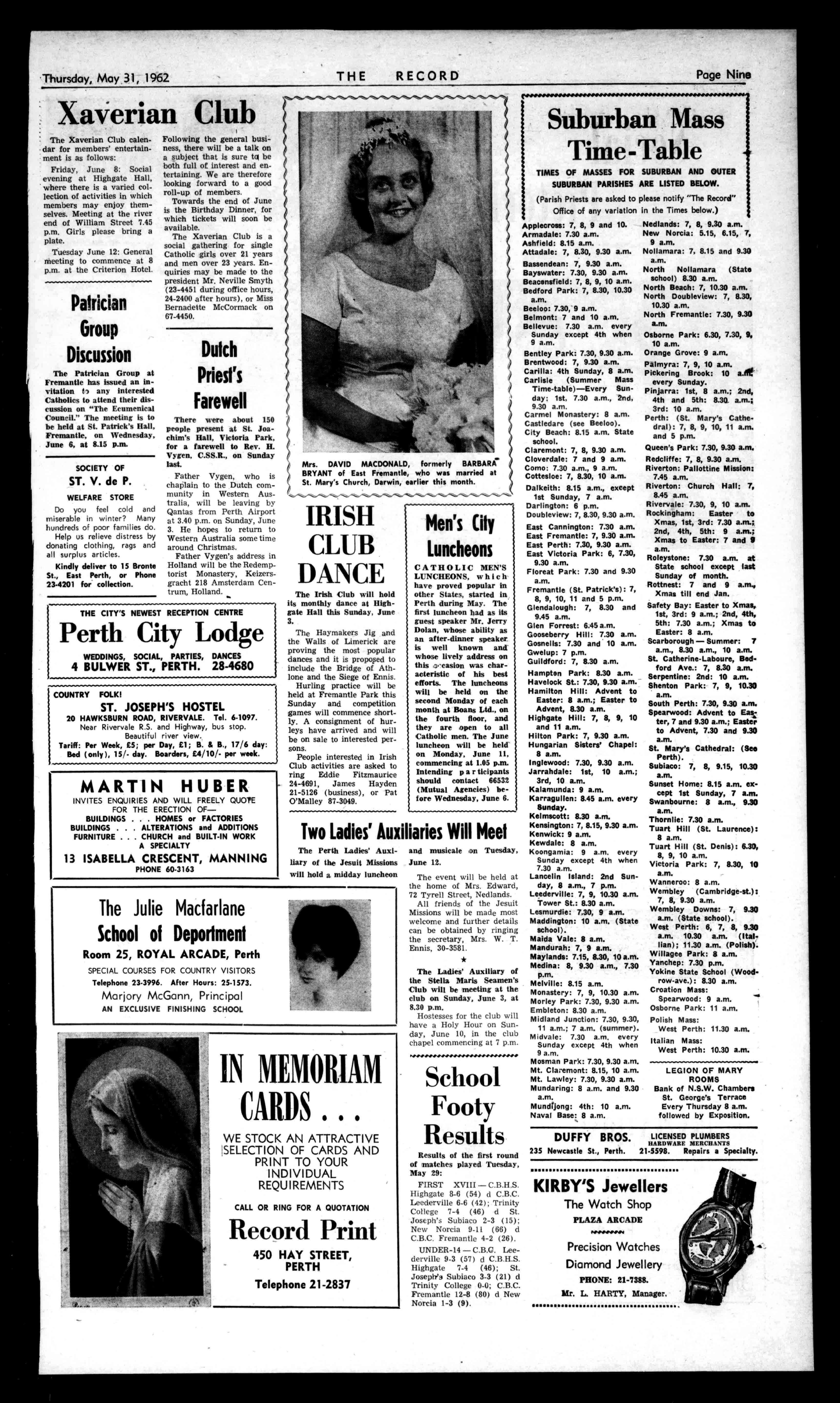 Besureof AFRIENDLYWELCOME TheStaffandProprietors, M.A.andE.M.McDonnell EUROPEANNIGHTCLUBRESTAURANT FULLYA118-0011MITIONED DancingandEntertainmentNightly 27LAKESTREET,PERTH-23-1589 FRI1ATEROOMFORPARTIES-WESPECIALISEIN"MEALS TOTAKEAWAY."RingandOrder. WEDDINGSandPARTIESONSUNDAYS. LOOK! GOINGWINDOWSHOPPINGTHISWEEK-END? ThenDon'tMissOurDisplayofClean,SoundVehicles SPECIALS THISWEEK: 1930VANGUARDSTATIONSEDAN L245 1955STANDARD8SEDAN £175 1955AUSTINA50 £395 ECONOMICALMOTORS 226OXFORDSTREET,LEEDERVILLE 1.B(PETER)COLLINS,Manager. Phone24-4760allhours.