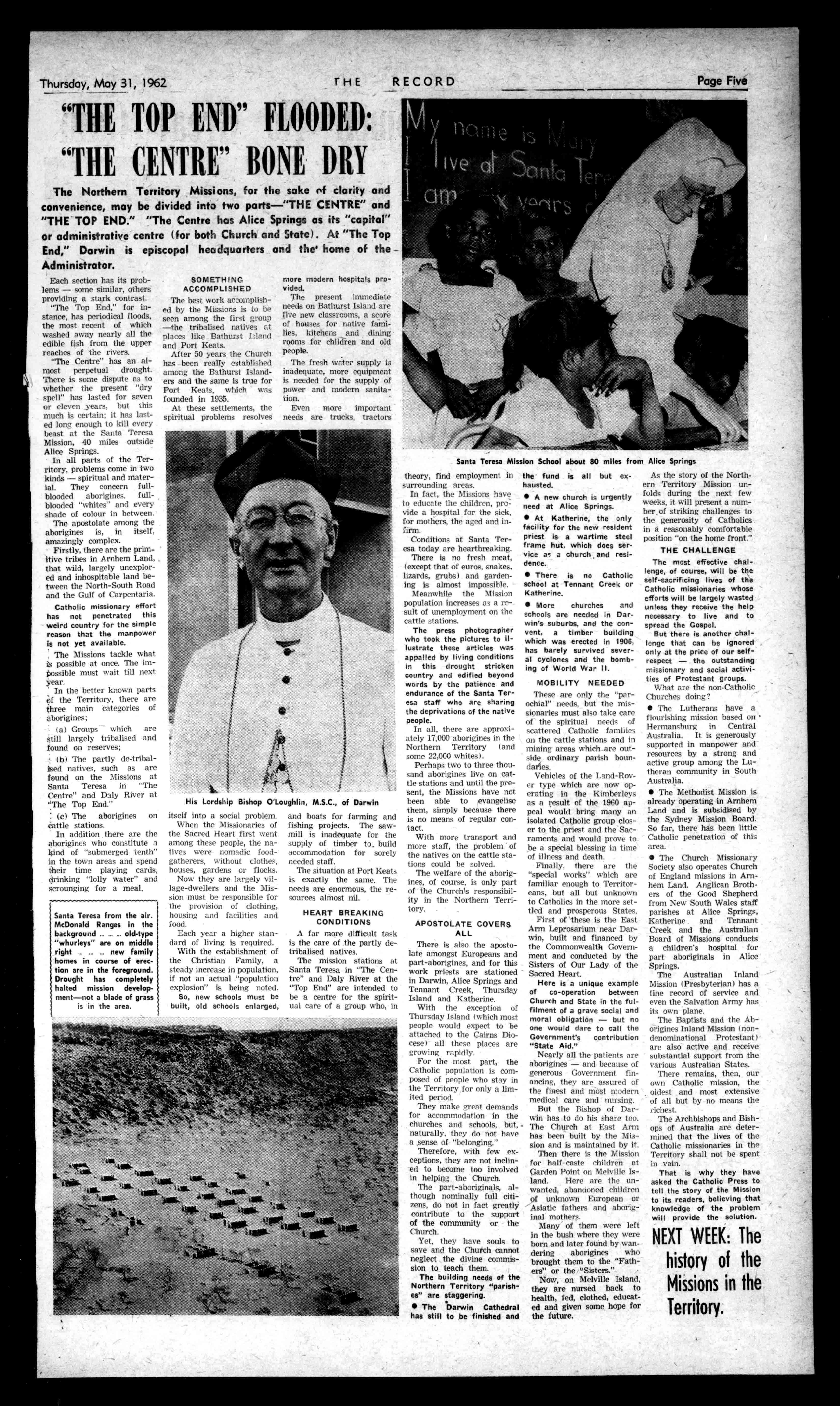 THETERRITORYMISSION EveryCatholicnewspaperinAustraliatodaywillpublishthefirstgrimchapteroftheplight oftheCatholicmissioninthe500,000squaremilesoftheNorthernTerritory. Thisisthestoryofanheroiceffortbyasmallgroupofmenandwomen-priests,religious andlaityundertheircourageousBishop,JohnP.O'Loughlin,M.S.C.-tobuildalivingchurch in