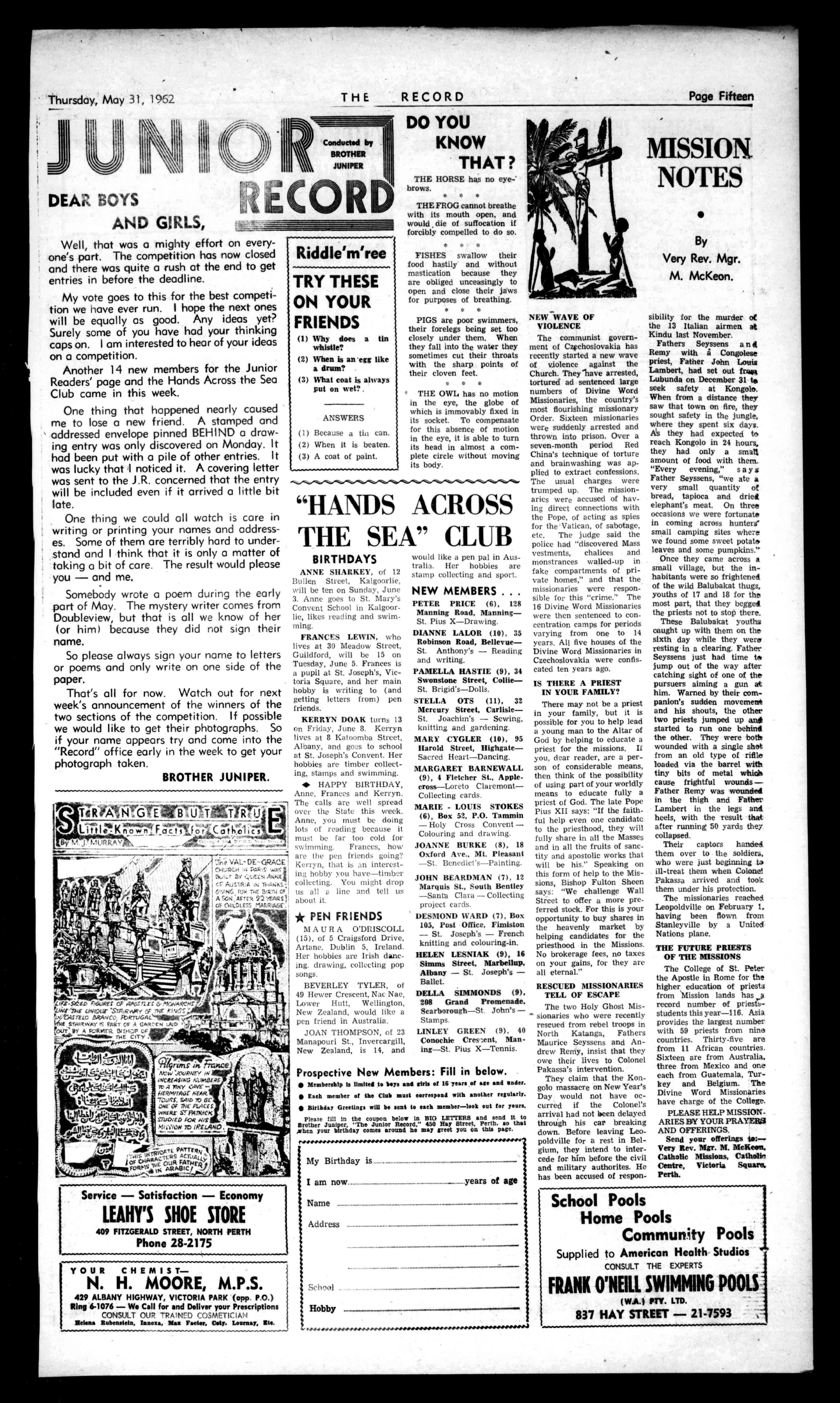 VeryRev.Mgr.M.McKeon. CatholicMissions.Catholin Centre,VictoriaSquare. Perth. SchoolPools