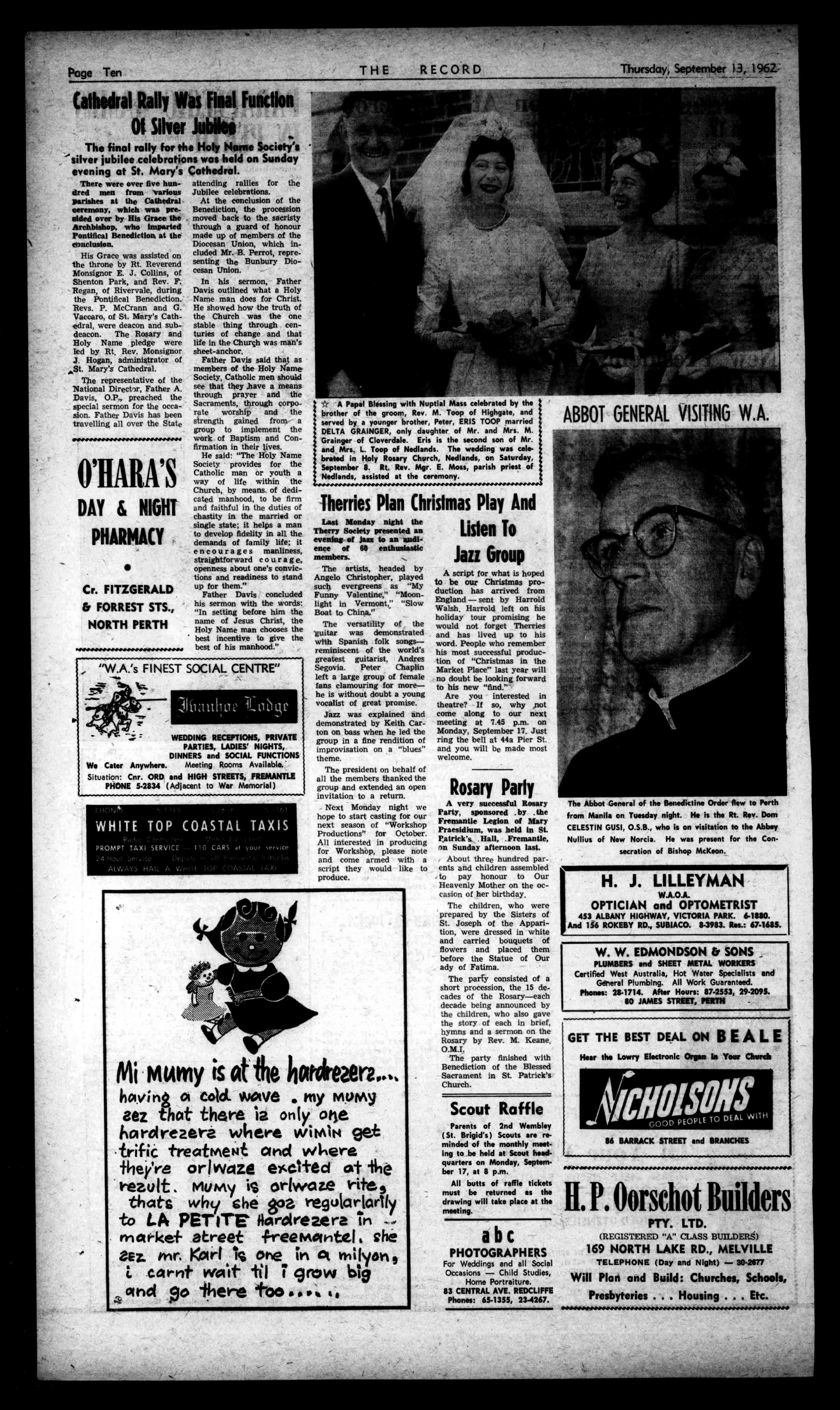 .1Vt.UT: PageSixteen PractitionersinAll BranchesofDentistry 790-794HAYST.,PERTH Pb....:21-7484,21-7837 Em ey:71.3601,66-1589. Principals:JosephL.Rogers; AlfredL.Rogers,DIDip,0.5. ConvenientforParkingeonbe ArrangedbyIntone. 'TheRecord 450HAYSTREET. BoxR1279,G.P.O.,Perth. Telephone:21-2837. SubscriptionRates:£2/5/6peryear;012/9perhalf-year. AllCorrespondenceshouldbeaddressedtoTheManager. DISPLAYADVERTISING:15/-persinglecolumninch,orby ContractRates.-ApplyAdvertisingDepartment. Thursday,September13,1962 ForTRUSAS BACKSUPPOPTS SURGICALSTOCKINGS Cu'.EXPERIENCEGiVrS ANDC.A.,. W.A.APOTHECARIESLID. Cf:/ &MUM,Its,f,rt),