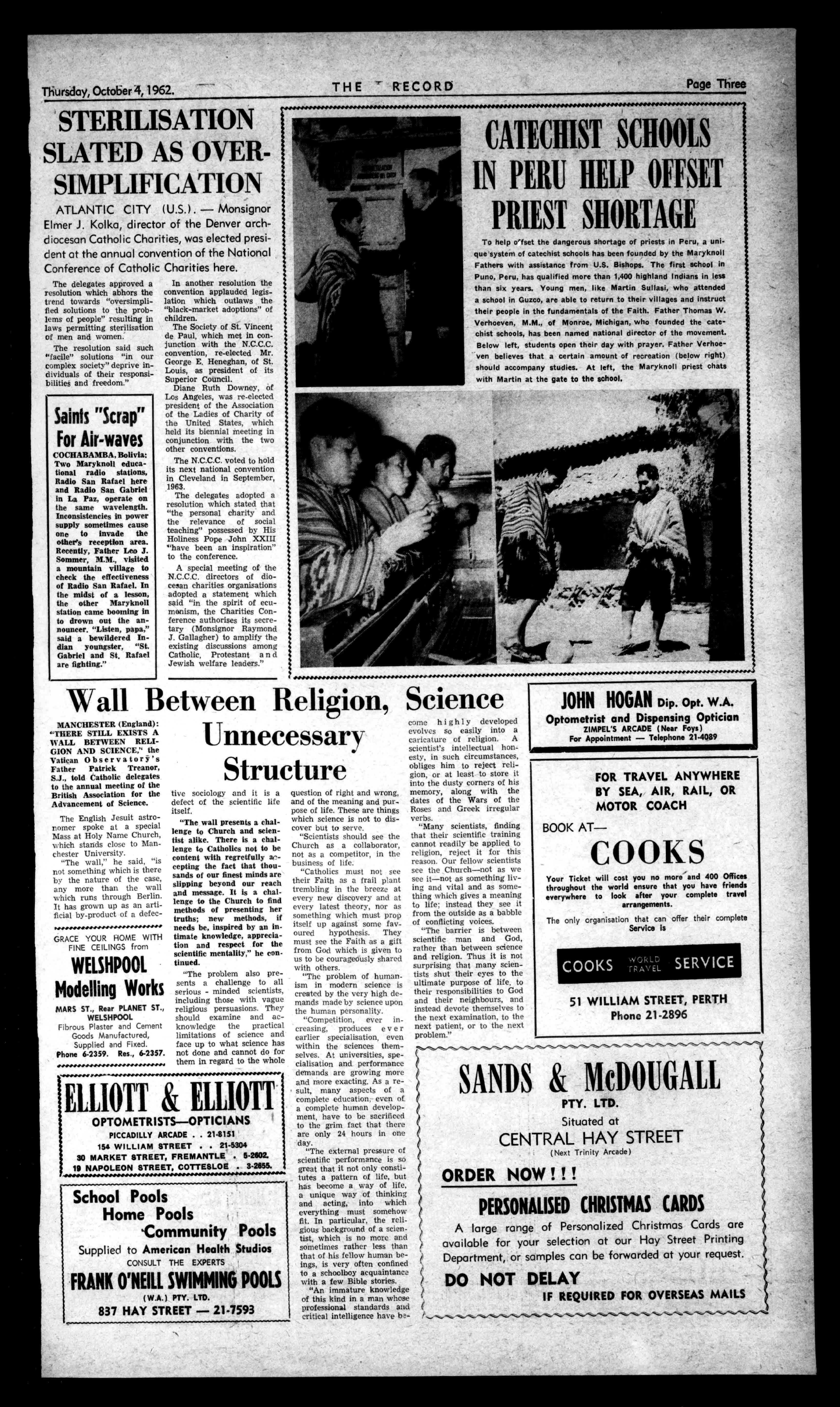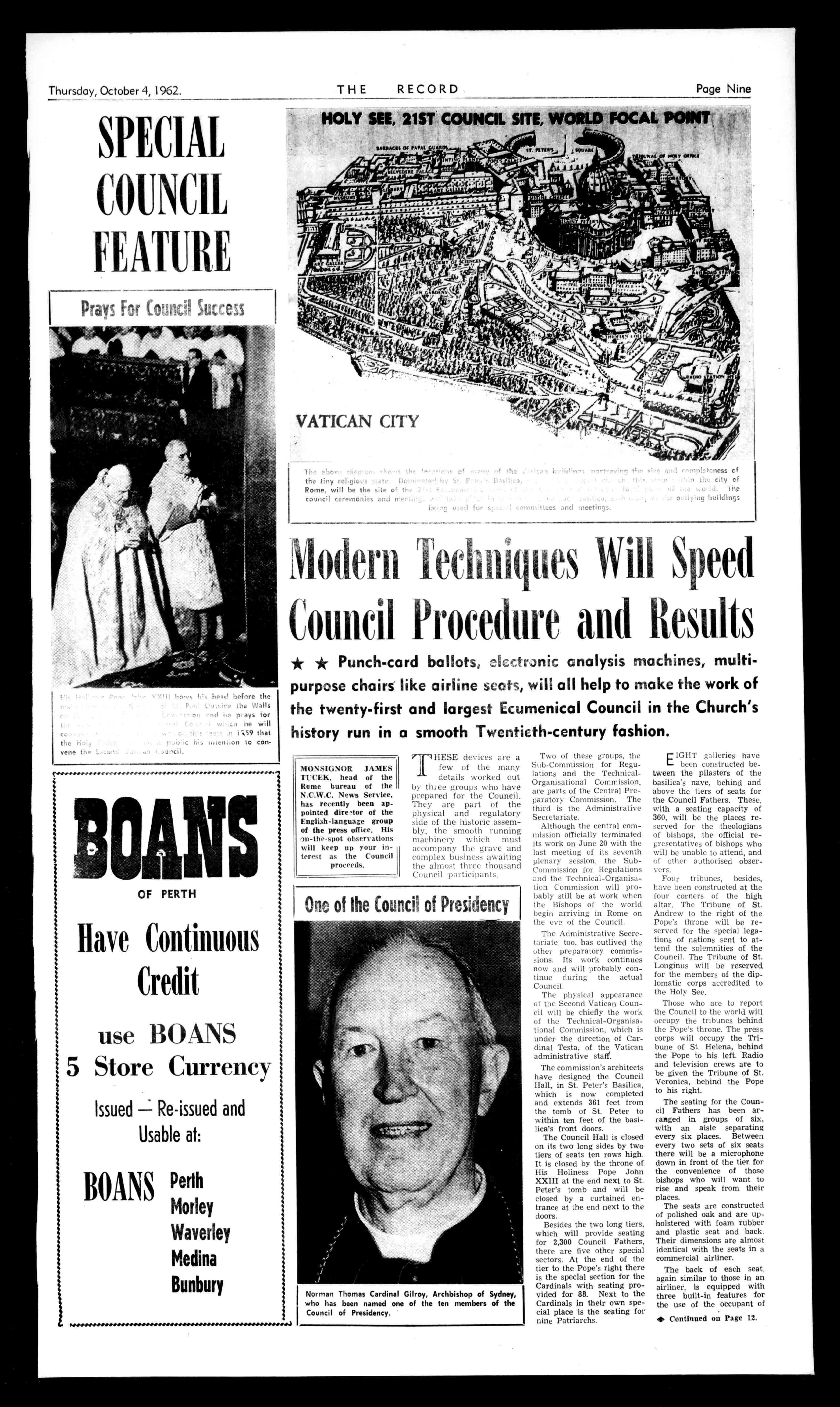 CaA41.-(< 6NQA Wiedul tskis ,LY4t f5OREWRRD THISPROPERTY ISBEING BYTHE kUSTRAIIAllWATCHINGCP AllCLIENTS INDEMNIFIEDTO TlwEXTENTof.1000 671825RING 1No.3051.Perth,Thursday,Oct.4,1962.,!=!;:icoln treT.jp%ip:;'", Price9d. WEARTHELATEST MEN'SFASHIONS NOW! PAYINEASY INSTALMENTS OPENACREDITSERVICEACCOUNTAT 602HAYSTREET TheTownHallIsopposite f-THEoFFIciaLBEGINNING... 1 AnotherBombScare InSt.Peter'sBasilica: PrecautionsDoubled I,/,',,,,,,,,,,.....1.4.,`,......ee,i.' Withfewstrokesofthepen,HisHolinessPopeJohnXXIIIaffixeshissignature, ti:usrra!:ingofnc,p1theconvokingofthe21stEcumenicalCounciloftheChurch. SecondVaticanCouncil,onlythethirdworldcounciloftheCatholicChurchin the 400years,willbeginonOctober11.Thisissuecontainsspecialreference tot!leCouncilinstoryandpicture.