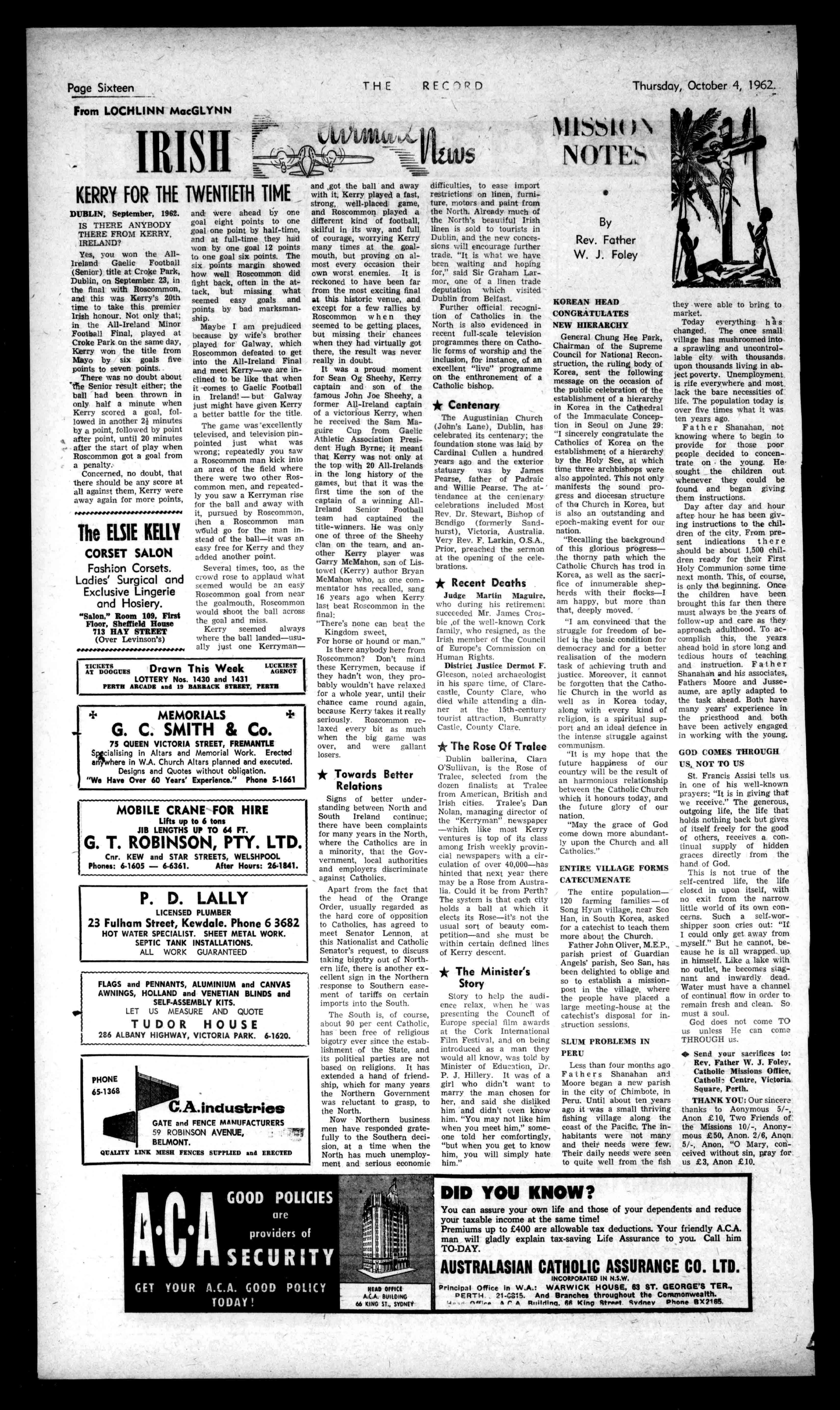 sistantpriestatSt. Mary'sCathedral,KalgoorlieandHighgate.He waslocumtenensatBedfordPark,Rockingham, andspent1953aschaplaintoSt.JohnofGod Hospital.In1954hewas appointedparishpriest ofNannupandwasthere whentheDioceseofBunburywascreated.He servedasparishpriestof Donnybrookin1956and wasappointedtoLake GraceinMarch,1957. FatherFitzgeraldwasin Irelandforlongleave duringpartof1959:60 andreturnedtoLake Graceinthatyear. Heissurvivedby brother,Patrick,anda sister,Breda,inIreland. daymorning.