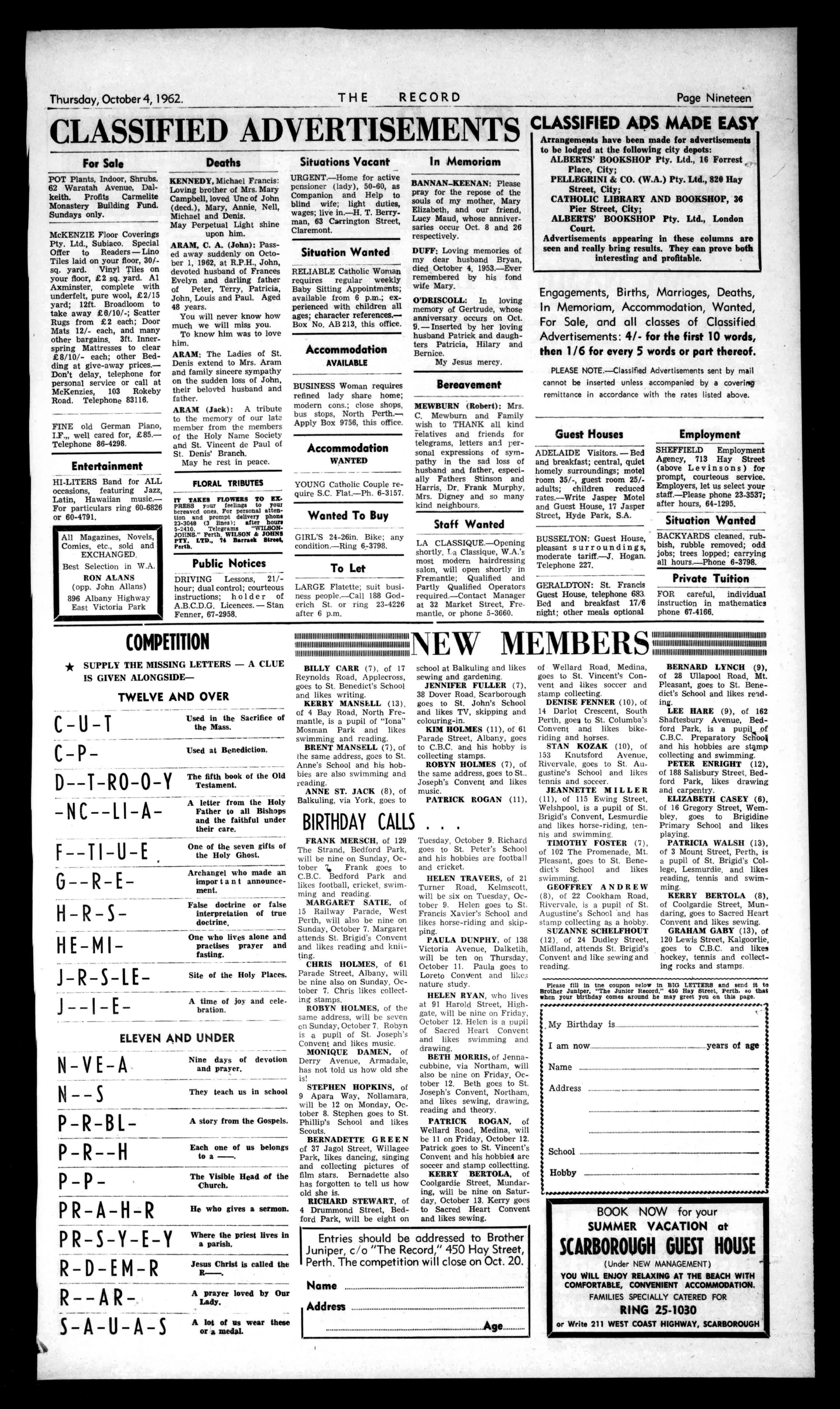 11.44i.k.Aku\ke Arkop k i4eock 4.tn THISPROPERTY ISBEING BYTHE AUSTRALIANWATCHINGC° ALLCLIENTS INDEMNIFIED10 rhoEXTENToft1000 RING 671825 he11?ecot No.3051.Perth,Thursday,Oct.4,1962.;,;R=.:'sr.eid,,,, NPL.4)i.ap:;.-, Price9d. WEARTHELATEST MEN'SFASHIONS NOW! PAYINEASY INSTALMENTS OPENACREDITSERVICEACCOUNTAT 602HAYSTREET TheTownHallIsopposite THEOFFICIALIEGINNINC1AnotherBombScare InSt,Peter'sBasilica: PrecautionsDoubled Wtha strokesofthepen,HisHolinessPopeJohnXXIIIaffixeshissignature, - !tyoFfi,Irltheconvokingofthe21stEcumenicalCounciloftheChurch. Council,onlythethirdwisiIdcounciloftheCatholicChurchin yea's,wiltbeginonOctober11.Thisissuecontainsspecialreference tat' instoryendpicture. waict4uinessonthepartofworkersin St.Pe5'errt.basFiceiscveditAw;:"Apreventing theexp!,..$7,ionc)fanincendiarybo:yth,andthere. THEDETONATOROFA SE('0NDBOMB