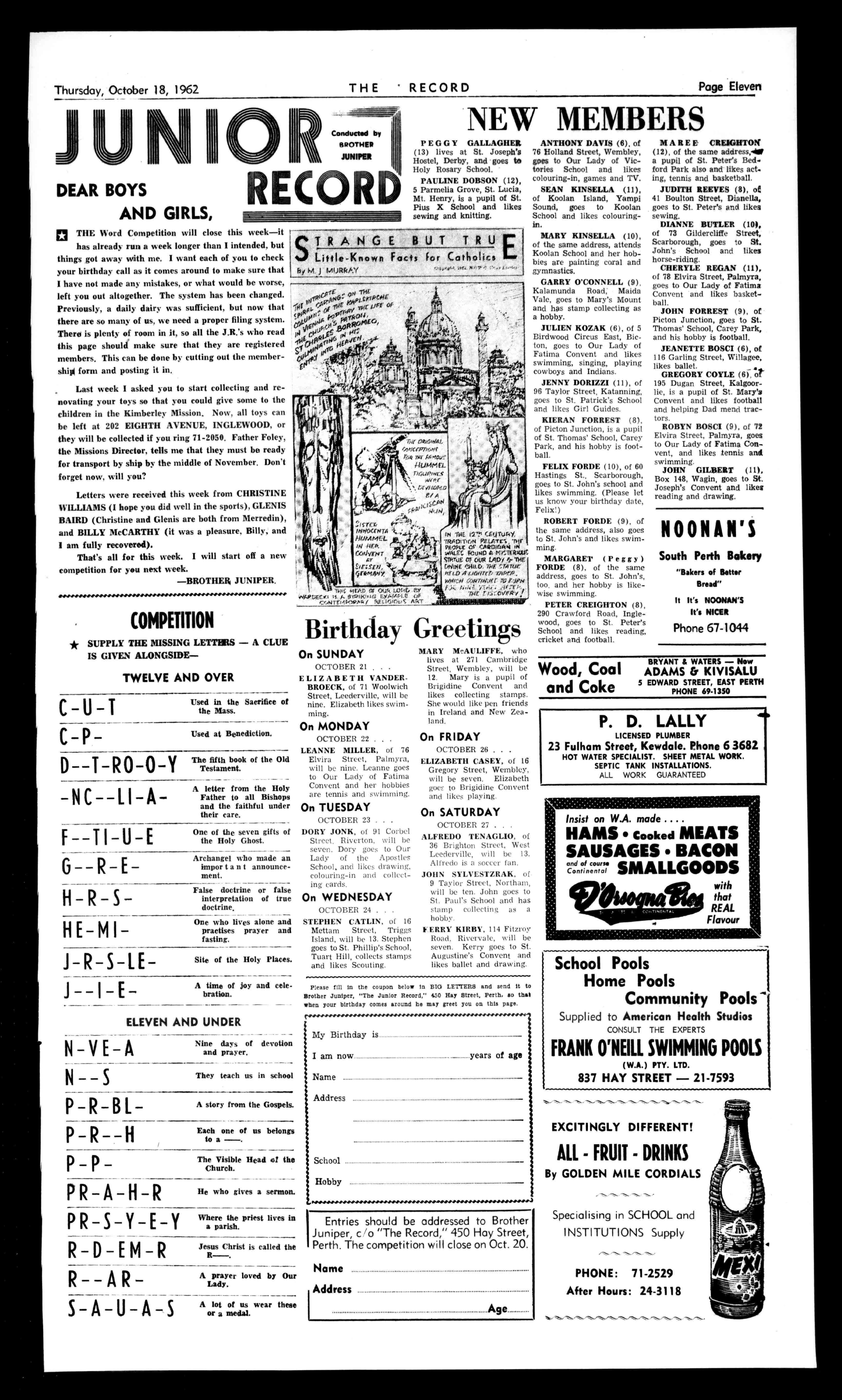 PageSixteen PractitionersinAll BranchesofDentistry 790-794HAYST.,PERTH Phones:21-7484.21-7837 Emeeeeeeyi71-2601,86-1639. Principals:JosephI..Rogers, AlfredL,Rogers,DDIP.D.8. ConvenientCarParkingcanbe ArrangedbyPhone. TheRecord 450HAYSTREET. BoxR1279,G.P.O.,Perth. Telephone:21-2837. SubscriptionRates:£2/576peryear;E1/2/9perhalf-year. AllCorrespondenceshouldbeaddressedtoTheManager. DISPLAYADVERTISING:15/-persinglecolumninch,orby ContractRates.-ApplyAdvertisingDepartment. Thursday,October18,1962 ForTRUSSES BACKSUPPORTS SURGICALSTOCKINGS OUREXPERIENCEGIVESEXPERT ANDCAREFULFITTINGS W.A.APOTHECARIESLTD. Cnr.William&MurraySts.,Perthlest.1887: BishopFultonJ.SheenDiscusses KnowledgeOrWisdomWhich? **ASTHEDOORSofschools,collegesanduniversitiesflingthemselvesopentoreveala fullpantryofcoursesforyoungstudents,itwouldbewellforthemtoreflectonwhether theywillreceivefromthosecoursesknowledgeorwisdom.