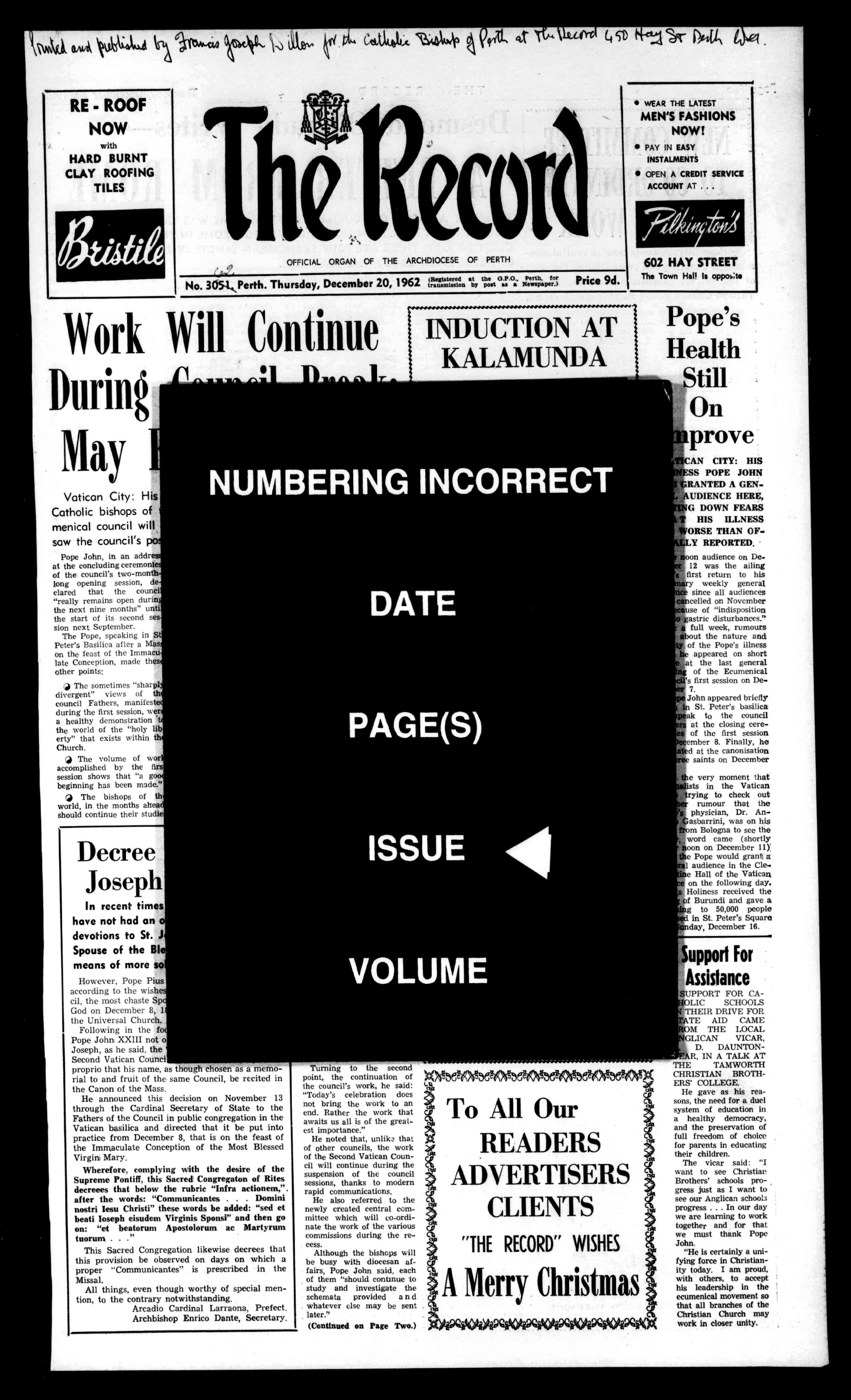 ArcadioCardinalLarraona,Prefect. ArchbishopEnricoDante,Secretary. INDUCTIONAT KALAMUNDA NUMBERINGINCORRECT DATE PAGE(S) ISSUE VOLUME