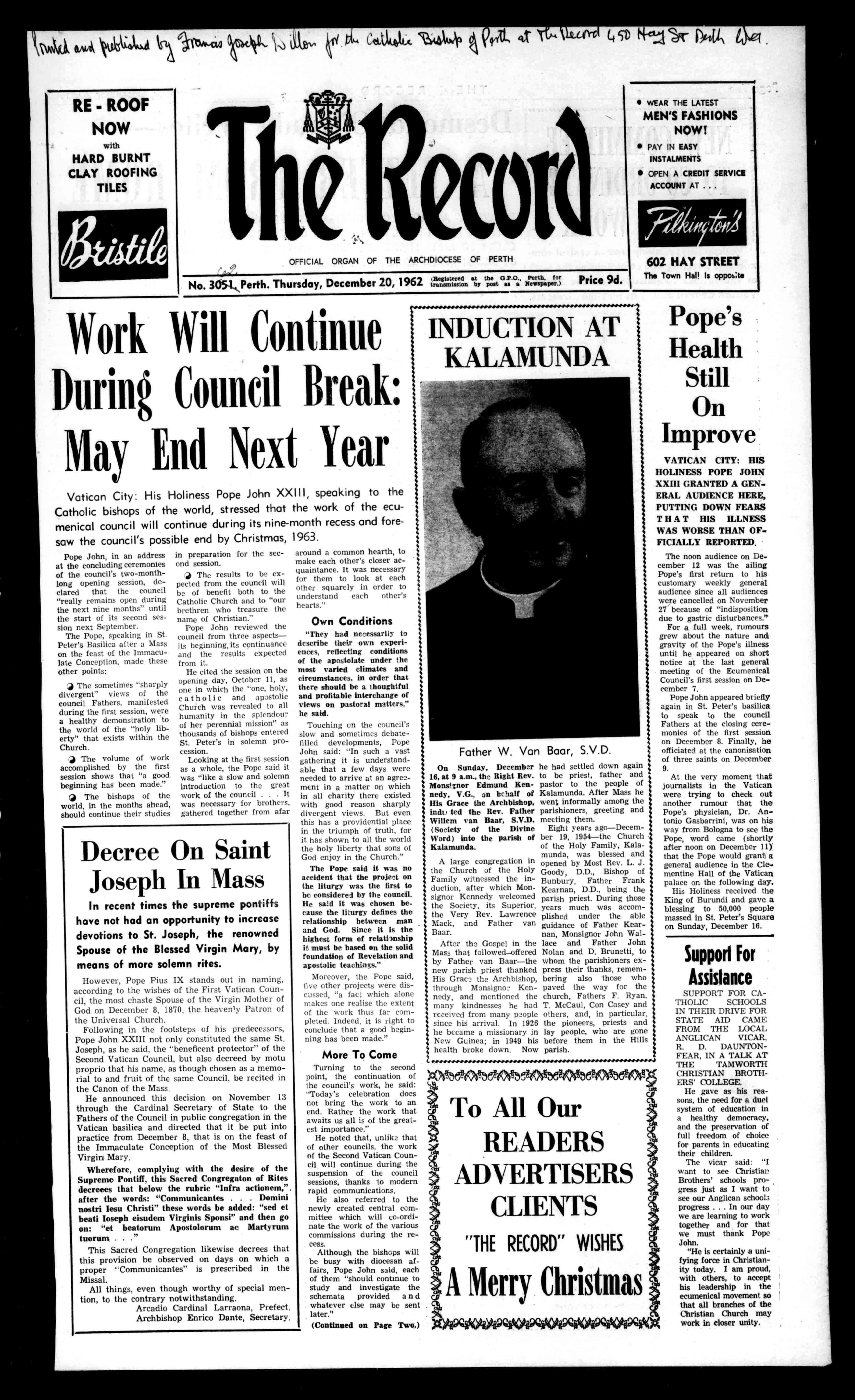 wAvi,a,w,kkui6\14,Li Cam, 'vett. tYV(4SD RE-ROOF NOW with HARDBURNT CLAYROOFING TILES &LA OFFICIALORGANOFTHEARCHDIOCESEOFPERTH No.305L,Perth.Thursday,December20,1962 '14 Price9d. WEARTHELATEST MEN'SFASHIONS NOW! PAYINEASY INSTALMENTS OPENACREDITSERVICE ACCOUNTAT 602HAYSTREET TheTownHal!Isoppos;ta