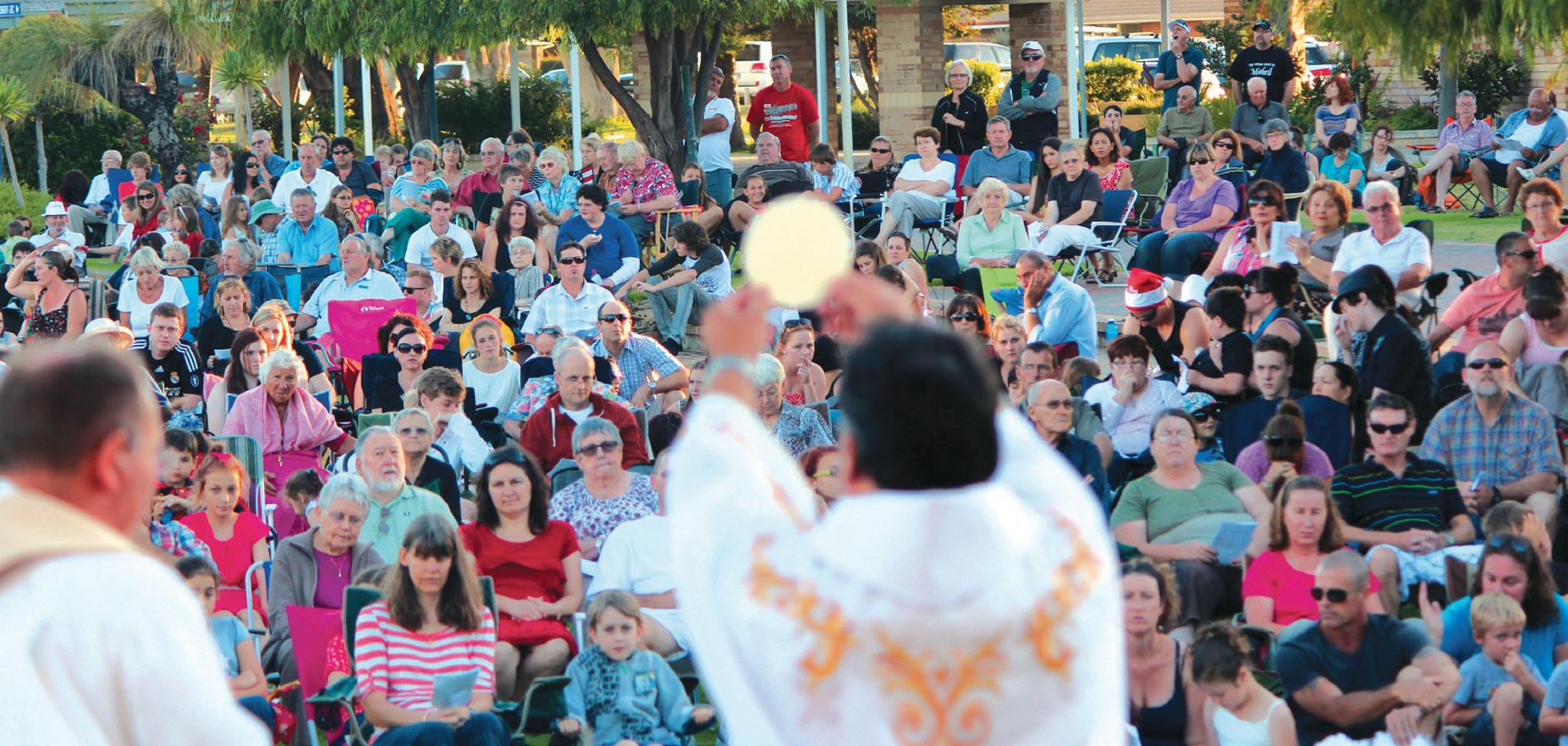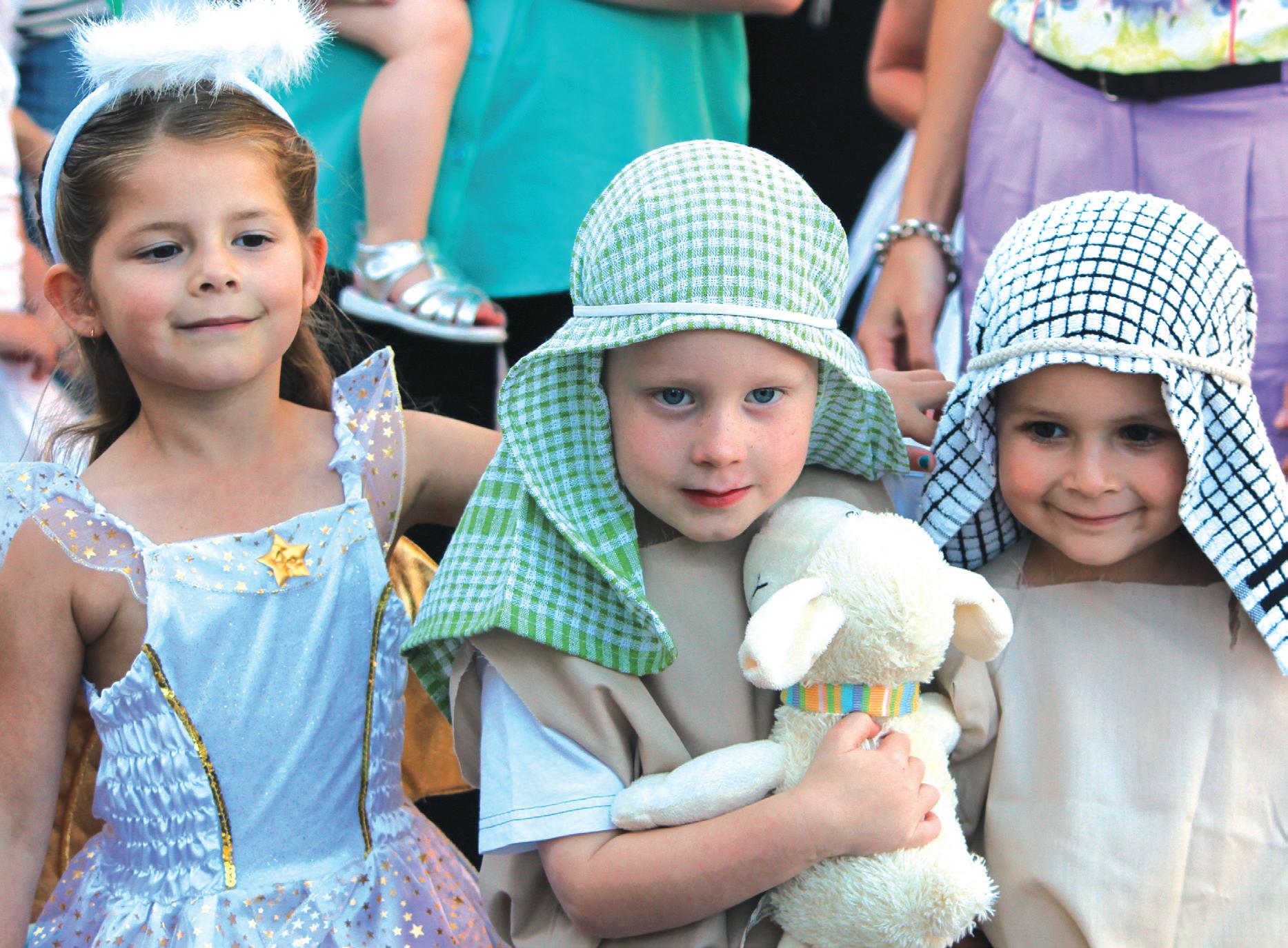 ON A WARM but pleasant evening, Kolbe Catholic College hosted Our Lady of Lourdes Rockingham’s Parish Christmas Eve Family Mass on the grassy surrounds of ‘The Avenue”. Approximately 400 turned out to attend Mass and to watch more than 20 young children act out the nativity scene before Fr Benny spoke about the importance of the birth of Jesus during his homily. Past and present students and staff provided the music and singing during the service and entertained the crowd before Mass began by singing carols. The increasingly popular family Mass concluded with sweets being handed out to all the children. The real-life nativity at the outdoor Mass was a complement to the nativity scene inside Our Lady of Lourdes parish church (top and bottom left).