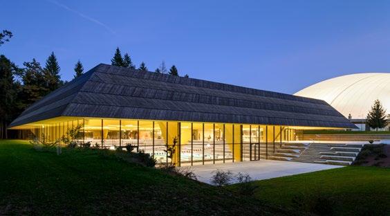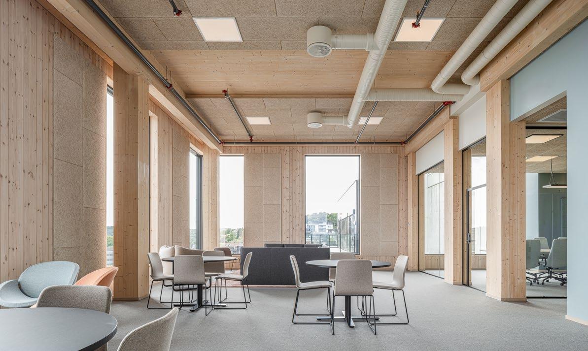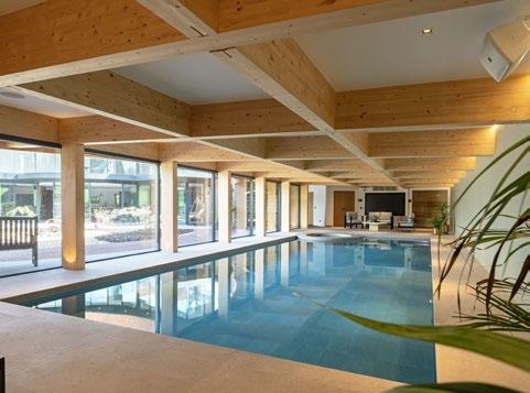 bonded wood fiber tiles are used in the pool area. In the common areas, acoustic comfort relies on a suspended ceiling of high-performance acoustic tiles behind the wooden slat structure, while the wooden roof structure offers superior sound absorption compared to many materials.