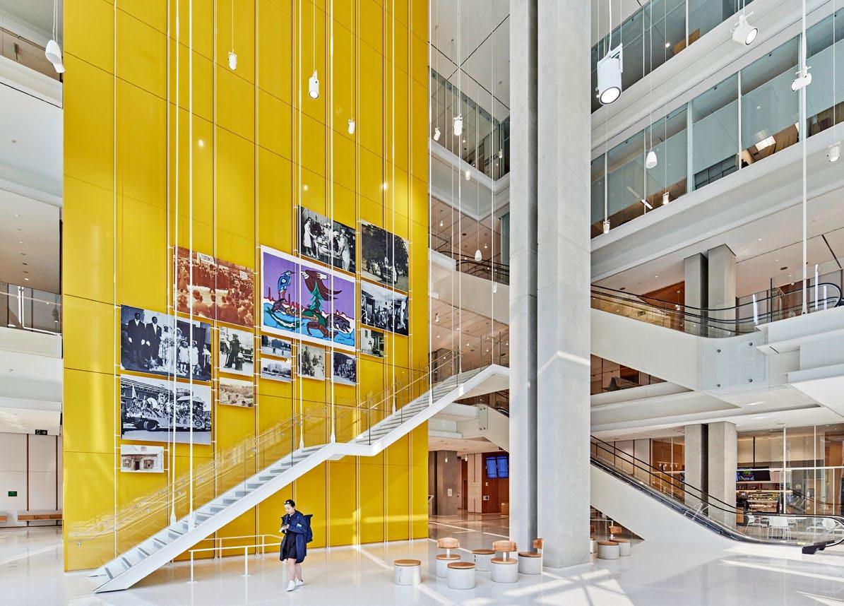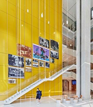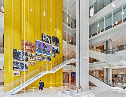 the full height of the building, with an amphitheater rising to the right and a gallery space towards the left.