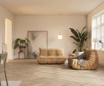 cement-bonded wood wool, and wall panelling made of filigree wooden slats, the lively structured floor catches the eye: beige porcelain stoneware tiles in 600 x 600 mm format from the Savona series by Agrob Buchtal.