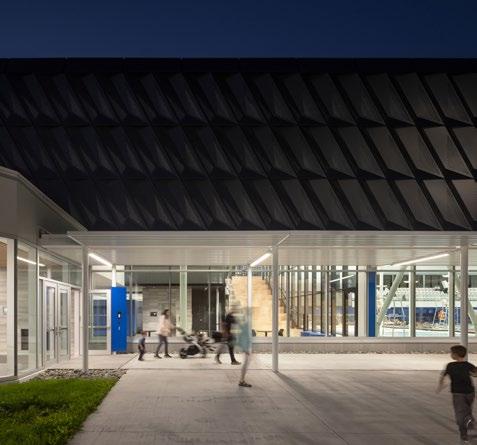 Connected to the Saint-Georges High School, the new Saint-Georges Multisport Complex is the result of a joint effort by the Beauce-Etchemin School Service Center and the City of Saint-Georges to provide toptier sports facilities for students and citizens. Designed by ABCP architecture, in consortium with MarieLise Leclerc architecte and Bilodeau Baril Leeming architects, the complex includes a double gymnasium, a recreational pool, a semi-Olympic pool with 10 lanes, as well as classrooms. It stands out for its wooden structures, large bay windows, perforated, diamondpatterned envelope, and energy performance. Inaugurated in the summer of 2023, it was quickly embraced by the community.