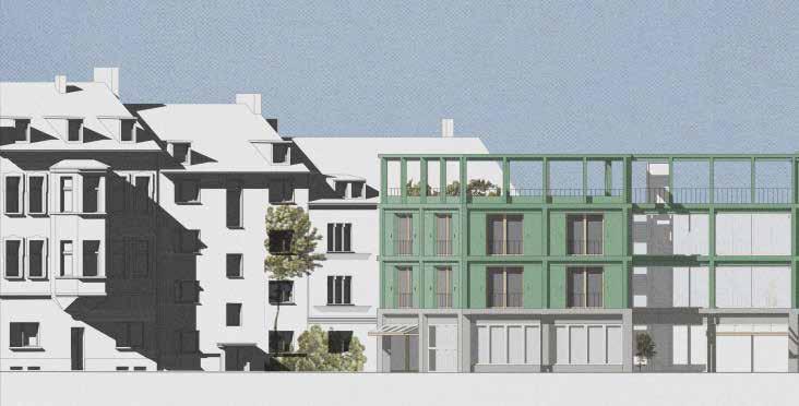 Um der Anonymität der Stadt entgegenzuwirken, sind am Erschließungskern der Wohneinheiten Orte für soziale Begegnungen vorgesehen. So wird der Weg zur Erschließung zu einem lebendigen Raum der Interaktion.Bei der Grundrissgestaltung lag der Fokus neben der Erschließung auch auf einer vielfältigen Grundrissorganisation, die unterschiedliche Wohnbedürfnisse berücksichtigt.
