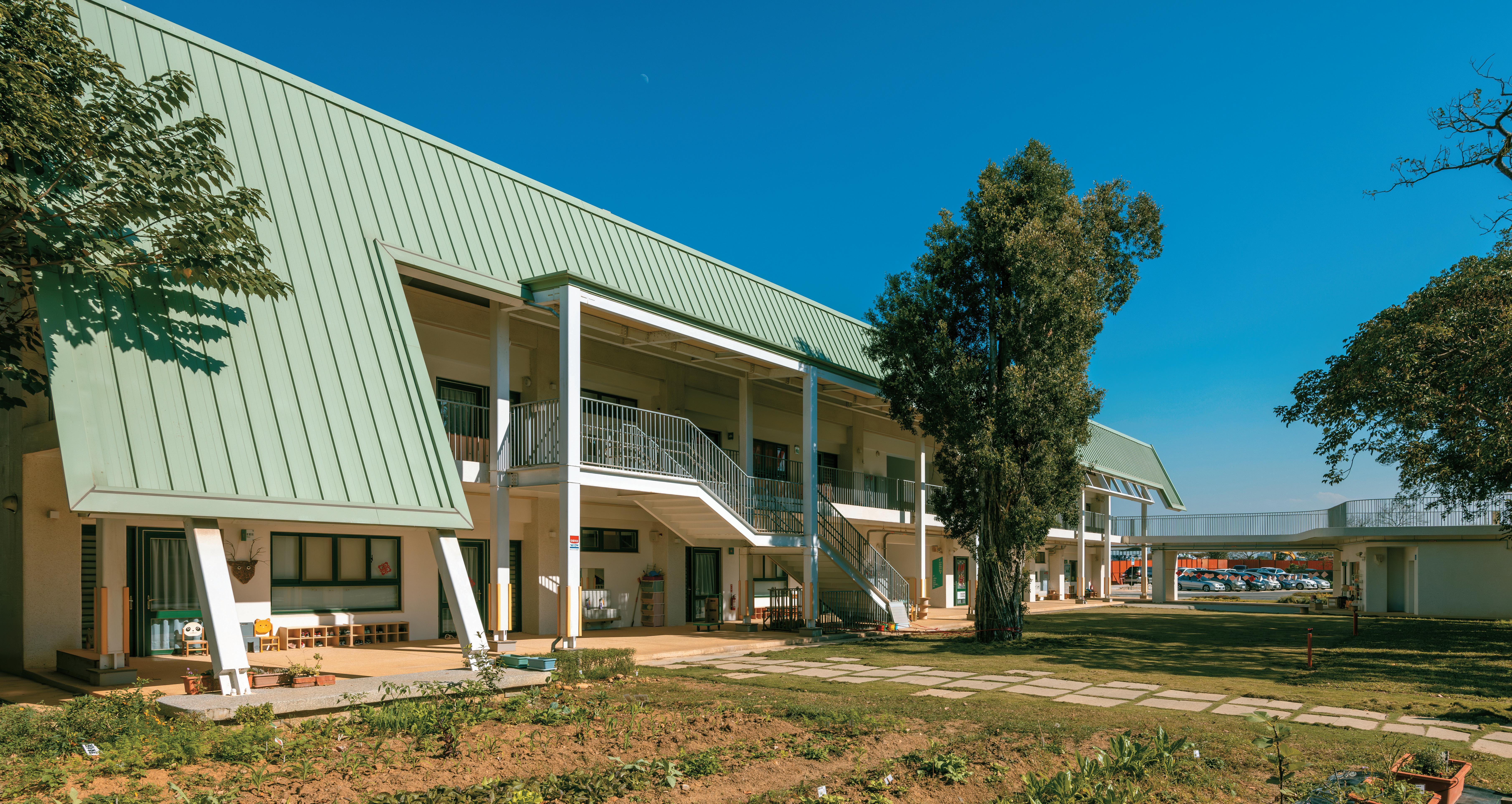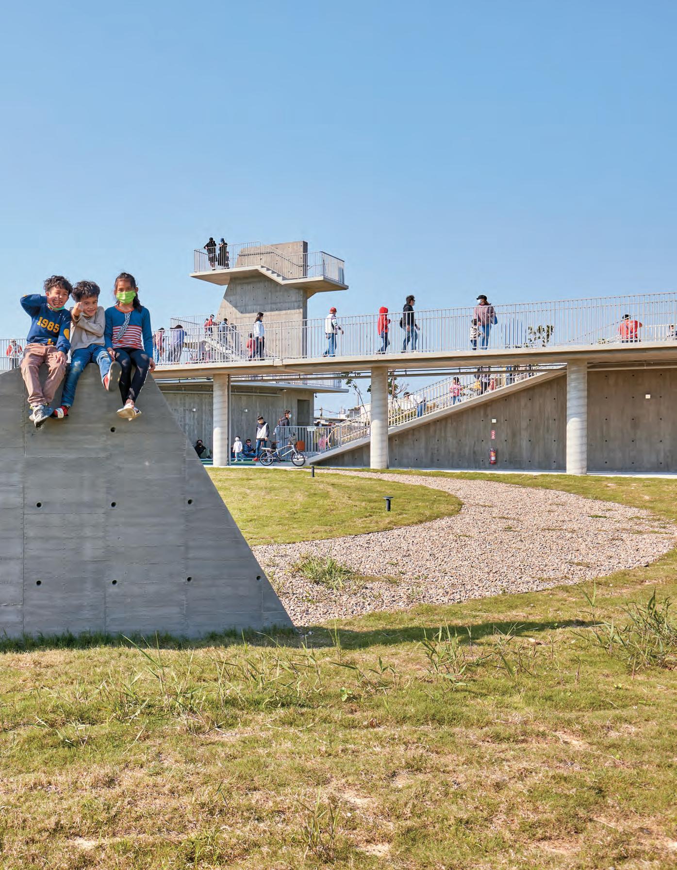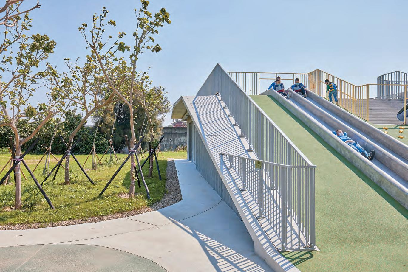 林:它算是一個遮蔭處,也可以變成滯洪的空間。我們把它留在 一個比較特別的位置,讓量體翹起來,因為這側沒有遮蔭的空間, 是希望孩子們跟老師在體育課時,有蔭涼處做暖身或休息,這個 動作的確也花很多代價去思考其結構性。在沒有活動的時候,小 朋友下課也會躲在那乘涼、嬉戲,我覺得也是蠻好的,當初的期 望值有達到。