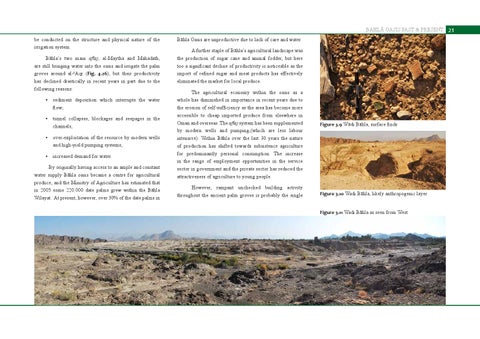 BAHLĀ OASIS PAST & PRESENT be conducted on the structure and physical nature of the irrigation system. Bāhla’s two main aflaj, al-Maytha and Mahadath, are still bringing water into the oasis and irrigate the palm groves around al-ΚAqr (Fig. 4.26), but their productivity has declined drastically in recent years in part due to the following reasons: • sediment deposition which interrupts the water flow; • tunnel collapses, blockages and seepages in the channels; • over-exploitation of the resource by modern wells and high-yield pumping systems; • increased demand for water. By originally having access to an ample and constant water supply Bāhla oasis became a centre for agricultural produce, and the Ministry of Agriculture has estimated that in 2005 some 220.000 date palms grew within the Bāhla Wilayat. At present, however, over 30% of the date palms in