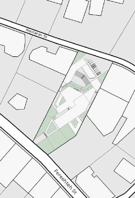 The site is located between the two streets of Nastaran and Fereshteh. The main entrance is on Fereshteh St as it is the more traffic heavy of the two and has better accessibility. The back entrance is for staff only. The building has retreated from both sides towards the center of the site to be as far as possible from the noises especially the ones from Fereshteh St.