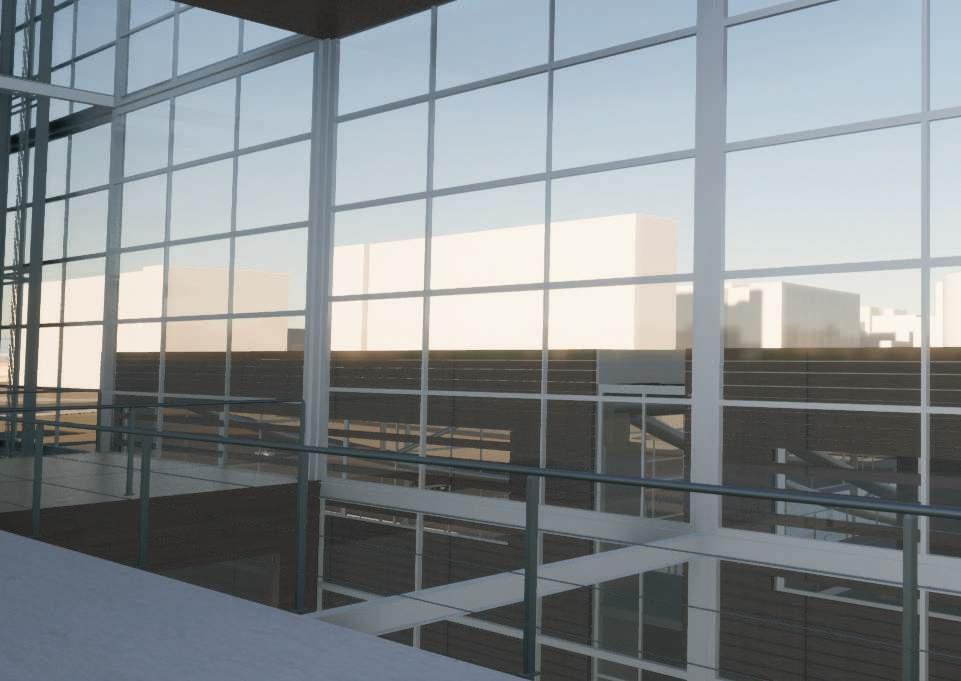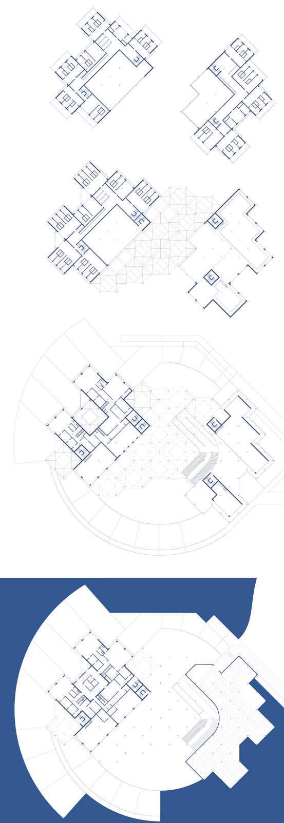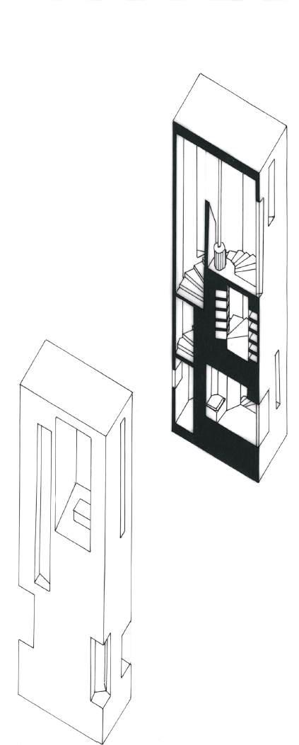 Au nord du site nous décidons de créer une nouvelle construction : c’est une bibliothèque et un data-center. Le nouveau bâtiment possède un rôle d’entrée sur le site de projet. Il est utile à la ville, il stocke de l’information et le savoir sous ses différentes formes, matérielle et immatérielle. L’objet se ferme à la ville pour s’ouvrir en son centre par un patio. Il se compose de la bibliothèque dans les trois premiers niveaux et du data-center dans les derniers étages.