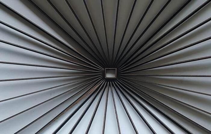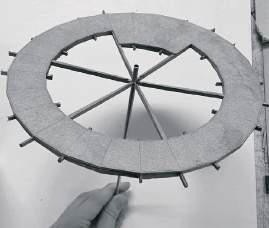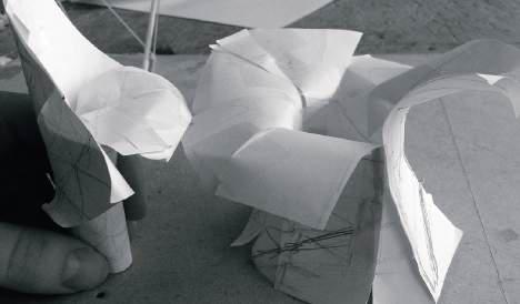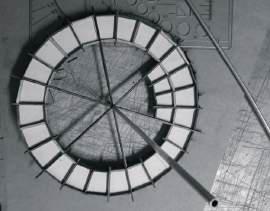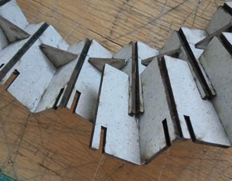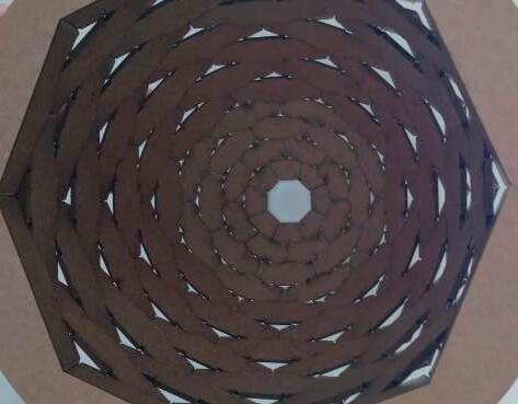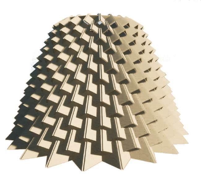 Ici, le dôme est un ensemble de superpositions de module (en triangle) qui viennent s’assembler par embrèvement. Chaque étage constitue la fabrication d’un model répété en miroir et assemblé par embrèvement également. Ainsi la particularité de la construction est de produire seulement 14 patrons des modules dont les dimensions sont différentes (car 14 étages) et dont la particularité est de n’avoir aucun biais à découper. En effet les assemblages de chaque embrèvement s’effectuent à 90 degrés.