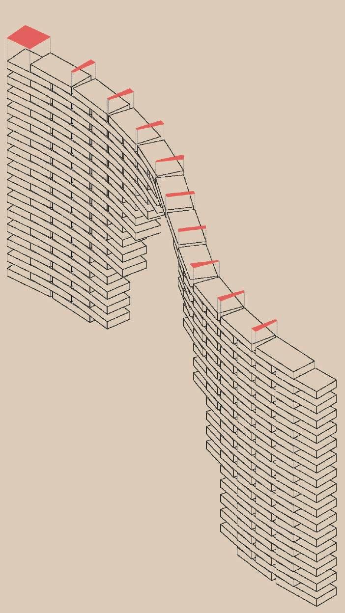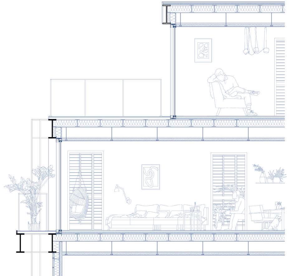 La résidence étudiante est construite sur un schéma plus clasique en poteau poutre acier. Les paroies quant-à-elles sont en ossature bois. Nous avons travaillé de sorte qu’un niveau en intègre deux : d’un côté les studios se supperposent et leur décalage permette de créer une coursive. De l’autre côté la partie circulation s’ouvre sur cette double hauteur et permet l’ouverture visuelle de l’espace. La structure se découvre au fur-et-à-mesure et laisse entrer la lumière naturelle. Nous imaginons des espaces communs de travail ponctuelle dans cette espace de circulation.
