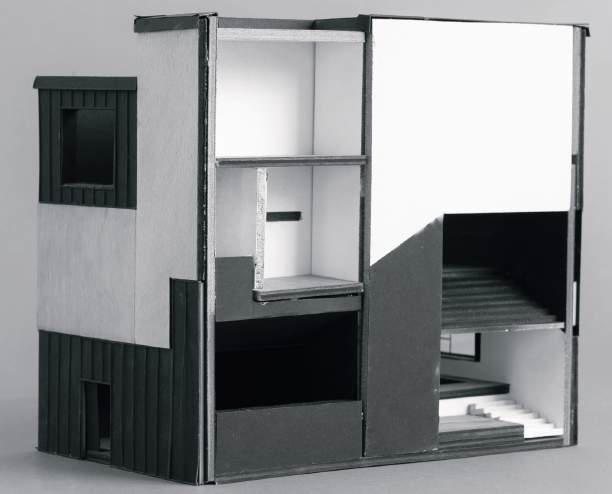 Pour ce projet, un client bien particulier est attribué à chaque étudiant par le professeur. Dans mon cas, le client est un «contrebandier fêt ard». Ce projet fait appel à l’imaginaire qui correspond au client. Ainsi il est possible de dégager deux parties de la maison qui correspondent à l’identité du personnage : une partie cachée, dans l’ombre, et une autre qui se doit d’accueillir la fête, dans la lumière. Le projet évolue en étage et le principe majeur est l’emboîtement (cf les schémas en mousse) de ces deux parties qui s’opposent (ombre/lumière) pour former une unité : la maison. Néanmoins une circulation centrale et privée permet de desservir les pièces intimes et les pièces «publiques» par des portes secrètes.