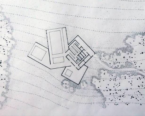 Pour ce tout premier projet de maison à un niveau, entre «deux dalles», l’espace s’organise tout autour d’un noyau fonctionnel et porteur laissant une grande liberté formelle de cet espace. En référence à la maison des Canoas conçue par l’architecte Oscar Niemeyer, la création des espaces et leur dimension s’effectue selon le simple tracé d’une courbe qui vient délimiter l’espace intérieur et extérieur. Ce dispositif permet également une grande fluidité à travers les différents espaces ; elle sait créer les espaces intimes et les espaces de vie partagés. Posée sur les bords d’un lac, son site, les parois séparant l’intérieur de l’extérieur sont entièrement vitrées et permettent de s’imprégner du paysage à n’importe quel endroit de la maison.