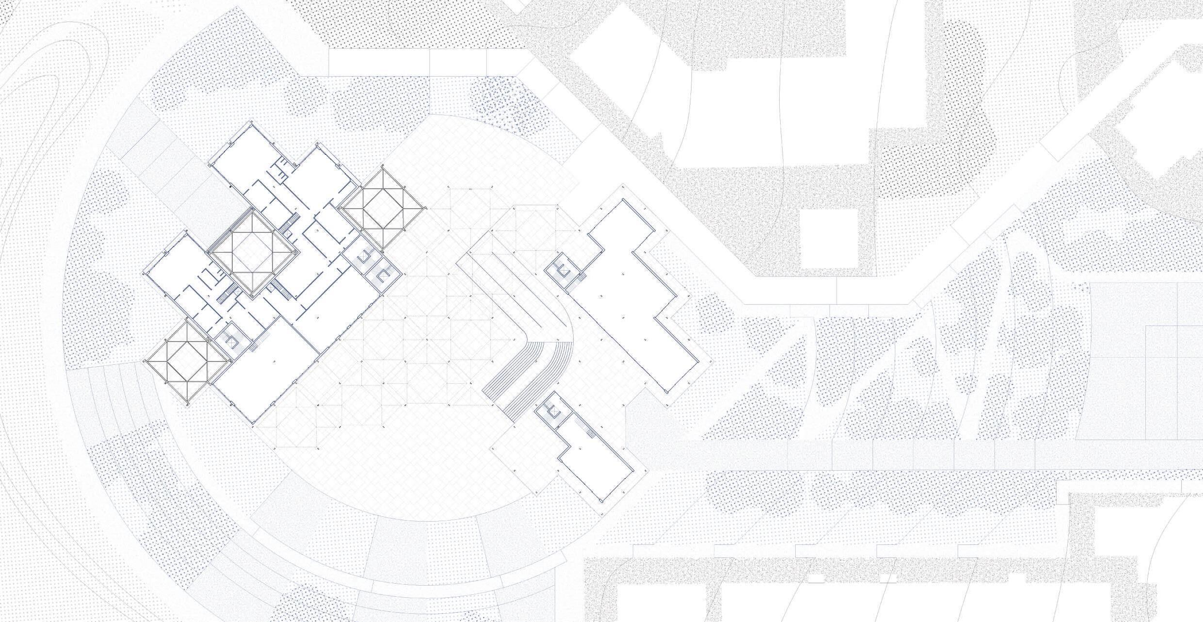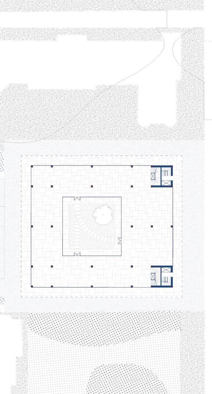 Le bâtiment à l’Ouest contient des salles de réunion et une salle de conférence privée. Cet espace dispose d’un patio qui apporte de la lumière naturelle à l’intérieur. Les arbres et la végétation du patio créent une ambiance agréable, davantage liée au sol naturel même si le bâtiment est souterrain. La partie Est est un amphitéâtre ouvert qui permet d’accèder à la bibliothèque et au bâtiment principal.