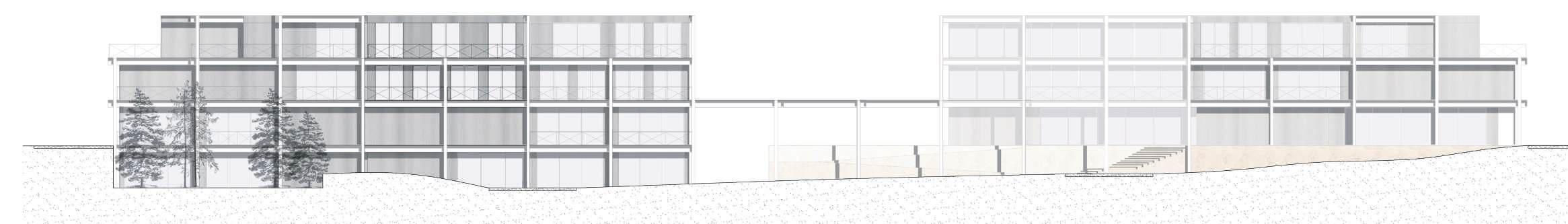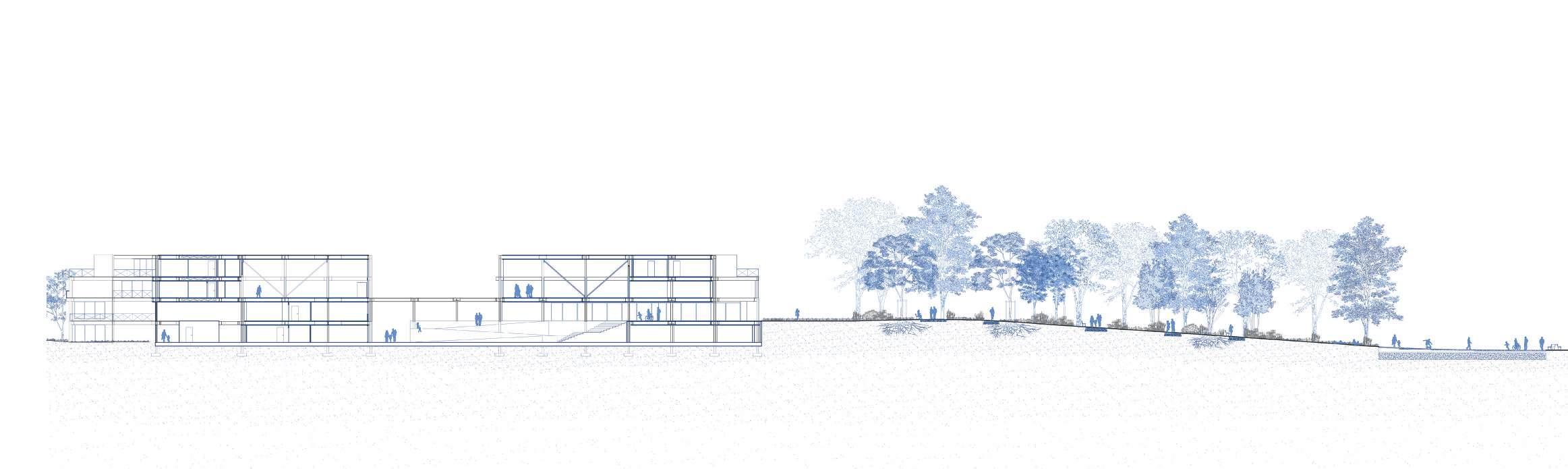 Le milieu dans lequel s’articulent nos deux bâtiments est une pièce paysagère. Elle a pour utilité de créer du lien sur l’ensemble du site et, à plus grande échelle, du lien entre le parc et la ville. L’aménagement de cet espace se dessine selon deux grands axes : elle est cadrée par la route existante au nord et s’étend par de nouveau chemin au sud vers le parc. Une rampe piétonne permet la montée progressive vers le bâtiment réhabilité et plus largement vers le parc. Nous modifions la topographie afin d’accéder directement au premier étage de l’ancienne école qui devient le RDC dans le projet. De cet manière, nous mettons en scène une place publique au niveau bas : c’est le RDJ. La redescente s’effectue par une rampe et un large escalier.