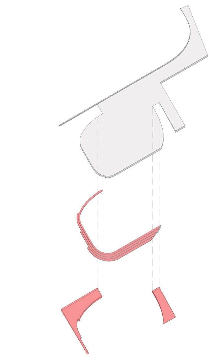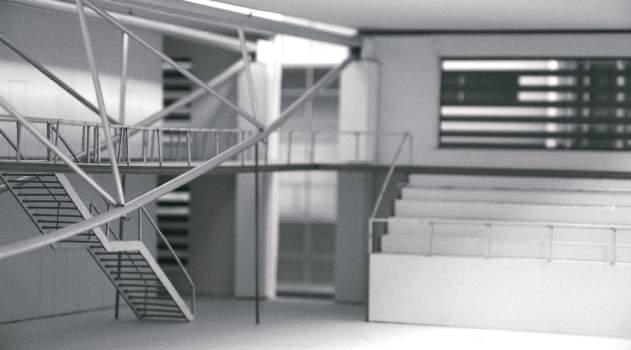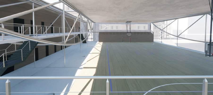 L’équipement sportif est un bâtiment suspendu au-dessus du périphérique parisien. Pour se faire nous dessinons un ensemble de quatre poutres treillis inversées en acier qui permettent de franchir 50 m. Le plancher est suspendu par des câbles aux poutres. La structure nous permet aussi une grande liberté dans le plan. Les deux portiques centraux créer une circulation à travers la structure qui sépare d’un côté le terrain de sport et de l’autre tous les autres programmes (salle de danse, dojo, vestiaire et toilette ect).