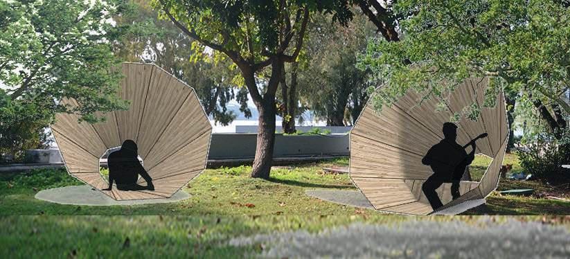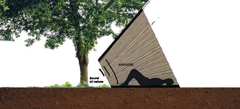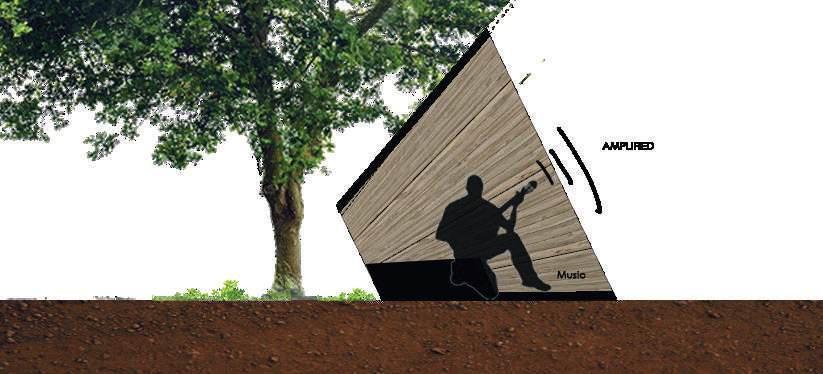 L’idée est de construire une structure qui amplifie les sons naturels. Il suffit de d’y asseoir afin de profiter de l’atmosphère de cette zone spécifique. De là également vous pourrez voir les constructions anciennes qui font partie de la magie du lieu et vous pourrez les observer. Cet structure accueillera de la musique, des voix et des chants. L’idée de ce projet est de créer un objet aux sons amplifiés : à l’image d’un gramophone ou de la forme d’un magnétophone. L’objet architectural sera utilisé par les habitants - ils occuperont cette structure, seront attentif aux sons environnants, se reposeront sous les arbres et à l’ombre.
