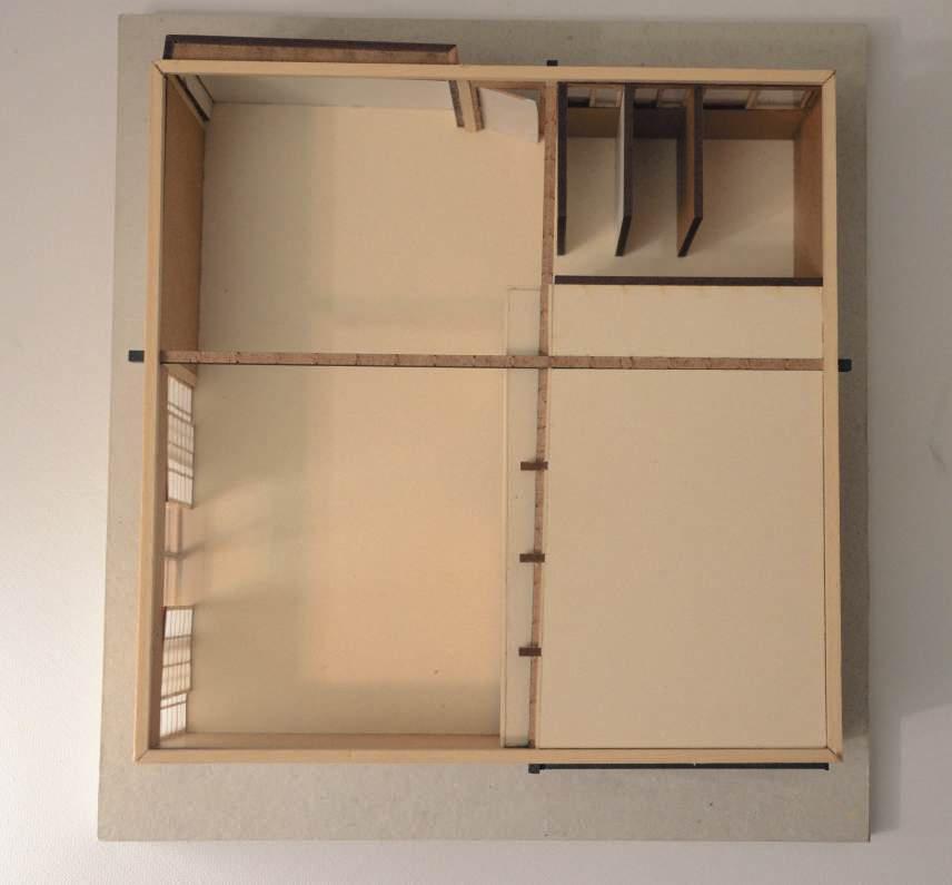 Cet exercice d’analyse a été très enrichissant, d’autant plus qu’il était impossible de visiter la maison. Il a fallu comprendre chaque élément de la construction à l’échelle de la structure jusqu’à la petite échelle des portes coulissantes traditionnelles japonaises (shoji) et la menuiserie des fenêtres. La maquette à échelle 1/50 se devait être la plus réaliste et conforme possible dans l’utilisation des matériaux ainsi que dans leur représentation.