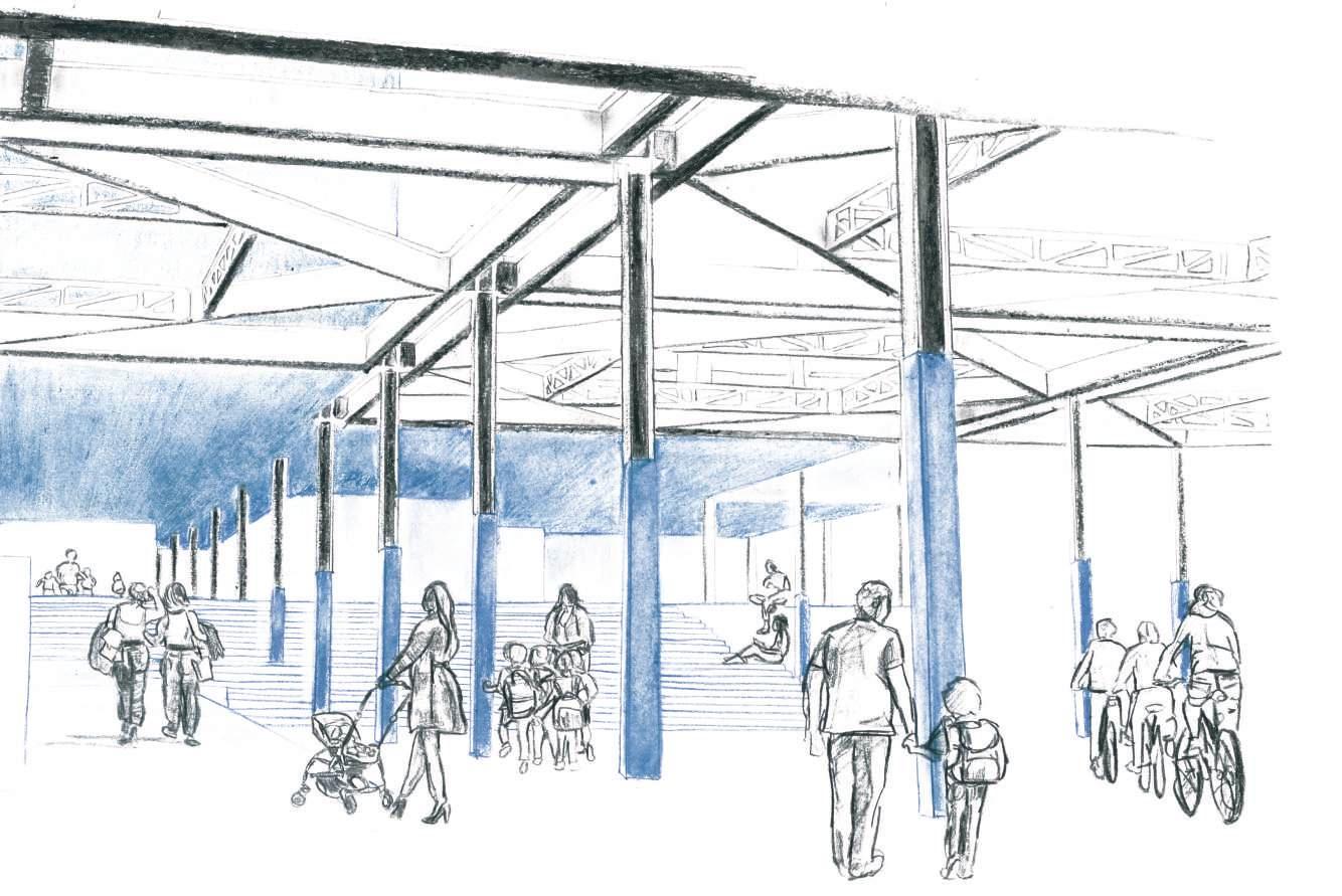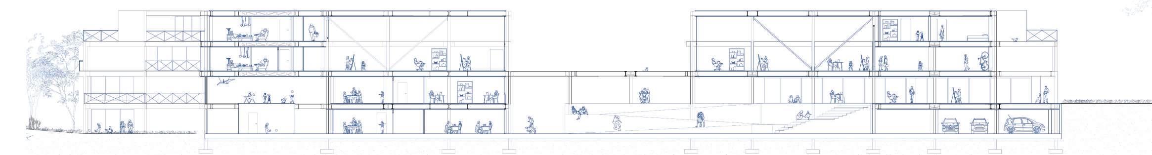 Les enjeux qui se sont posés dans la réhabilitation sont les suivants ; comment apporter de la lumière et de l’air dans des espaces d’une grande profondeur et comment s’adapter au dimensionnement de l’existant. La structure existante est composé par un ensemble de module. La structure s’étend sur 100 m de longueur et 60 m de largeur. Elle se compose de 2 modules : un petit module de 5,7m et un grande de 11,4m. Il y a entre chaque module un espacement de 90cm qui correspond au dédoublement de la trame dans lequel se place les poteaux. Nous mettons à nu la structure au niveau de la place publique que nous venons créer. Les programmes qui s’orientent autour de cette place centrale sont des ateliers d’artiste en double hauteur et des commerces. Les programmes en périphéries du bâtiment qui s’orientent principalement vers le parc et la pièce paysagère sont les logements d’une résidence étudiante et une crèche.
