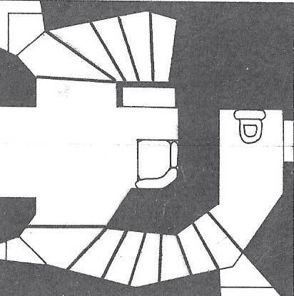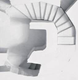 La bibliothèque est plus précisément comprise dans la montée des marches, elle est signalée par un ralentissement créé par l’élargissement en longueur et en largeur des marches, mais aussi par les bibliothèques qui apparaissent inscrites dans les murs de part et d’autre de l’escalier.