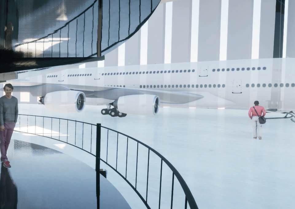 Le site de projet est en relation avec le musée national de la marine et les pistes de l’aéroport du Bourget qui le relient au musée de l’Air et de l’espace. C’est un univers particulier ; celui d’un site protégé et organisé autour de la rénovation et de la conservation aéronautique. Dans le projet, une promenade urbaine guidant le visiteur vers l’entrée du musée a pour but de sensibiliser au site existant. La mise en scène du musée par une large esplanade permet une arrivée progressive jusqu’à l’entrée. La façade qui fait face est composée de tôles acier, en tension avec la partie basse, enterrée, entièrement vitrée. Toutes les fonctions du programme sont enterrées : le plan est divisé en deux parties symétriques dont l’axe est l’espace de circulation. Le début de l’ascension se fait progressivement par une rampe. Au niveau 0, la salle d’exposItion du musée est libre et permet d’agencer les avions tout autour de l’espace de circulation. La rampe s’élève jusqu’à son point le plus haut à 10 mètres du sol. Il est alors possible de découvrir tous les avions à différentes hauteurs.