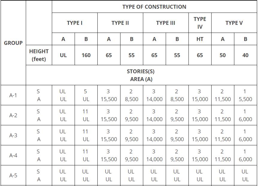 Building height limitations shown in feet above grade plane. Story limitations shown as stories above grade plane. Building area limitations shown in square feet, as determined by the definition od “area, building,” per story.
