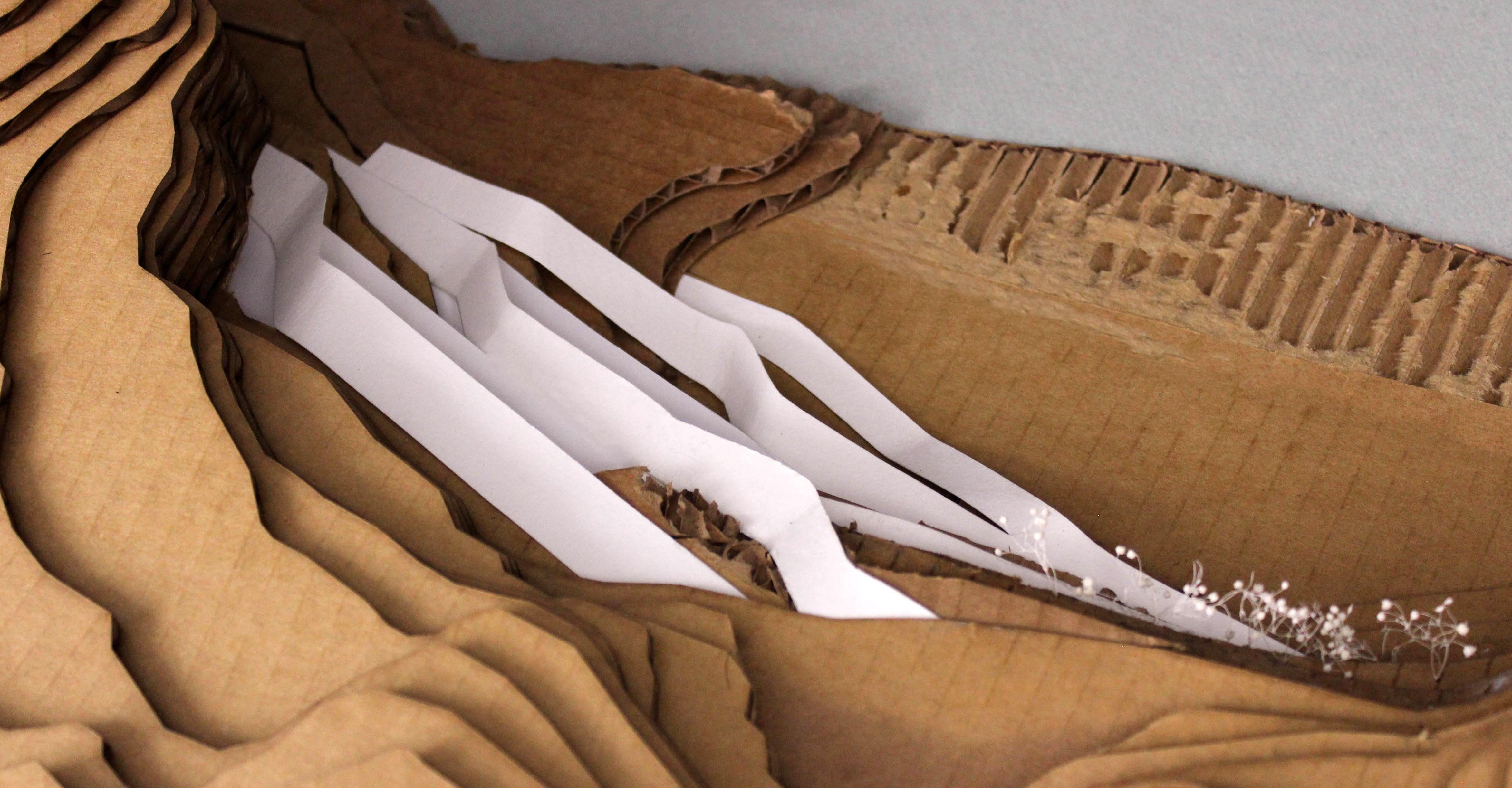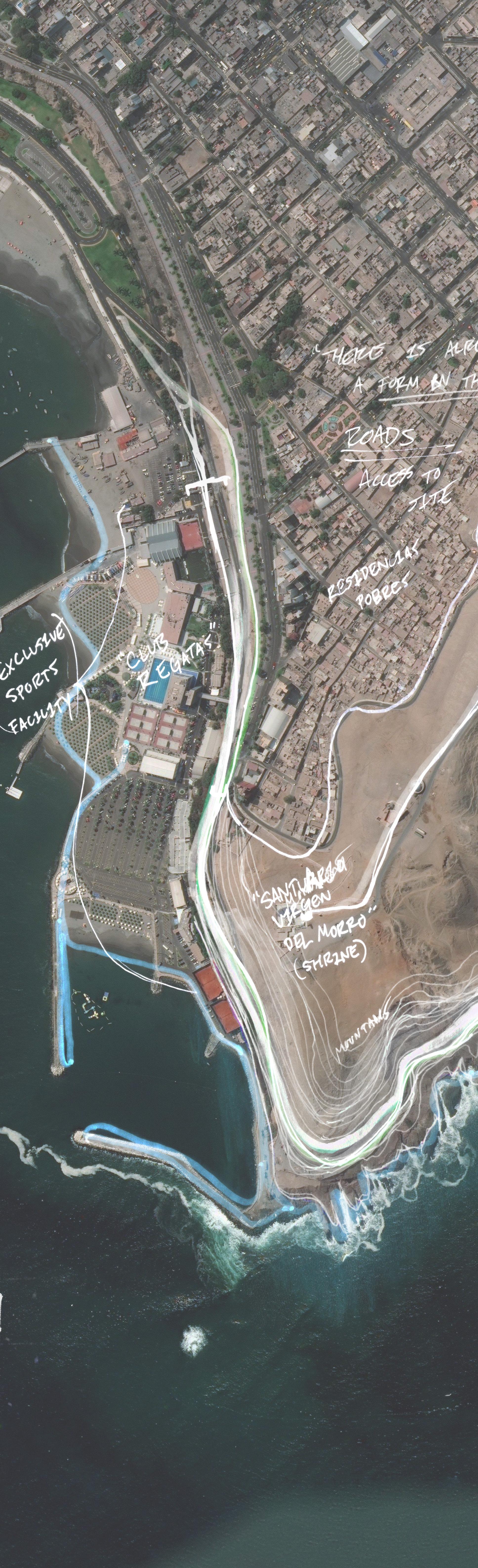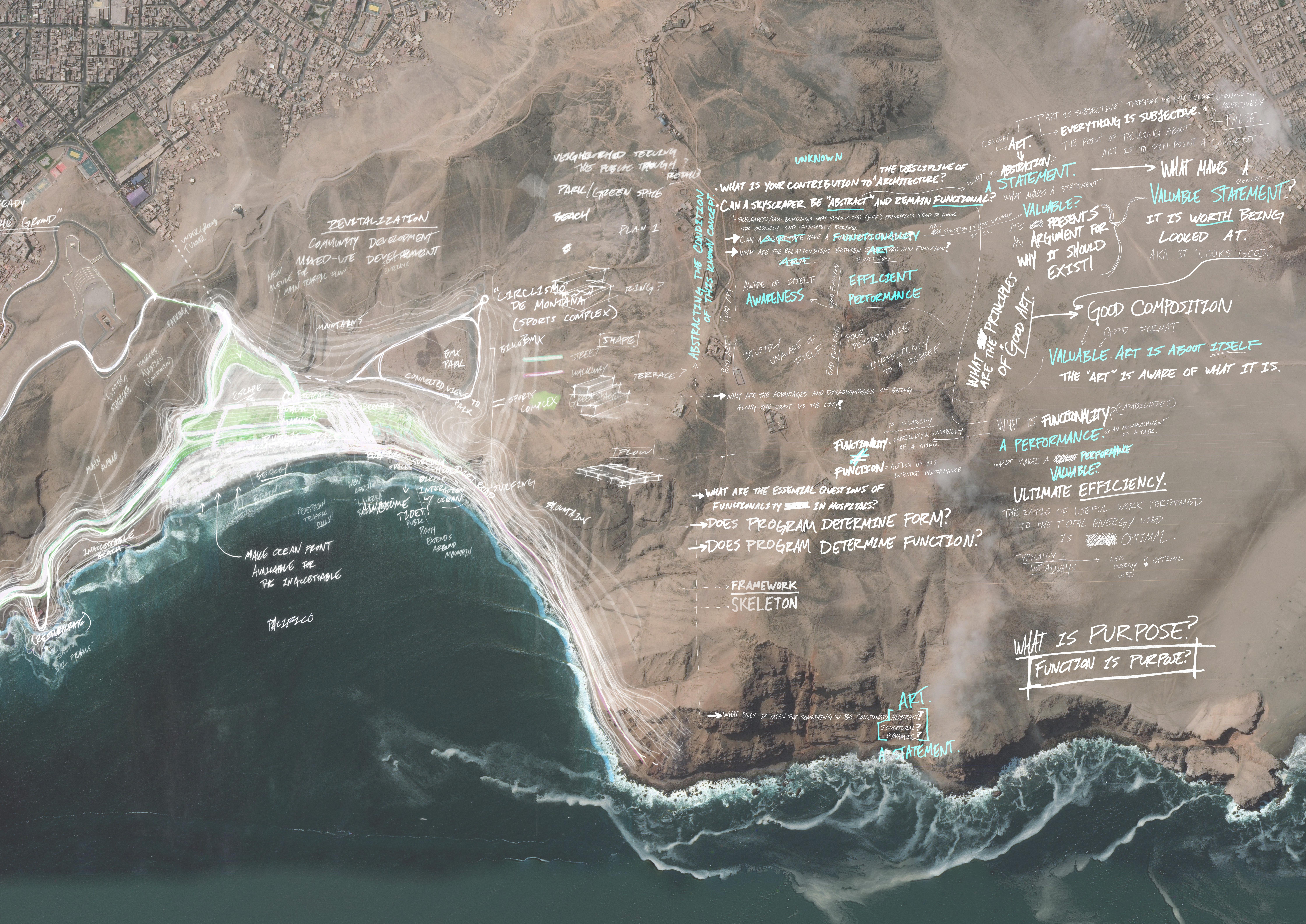 The topography of the site was indeed considered in the form making process, but not by framing specific views, rather suggesting movement through space. Topography lines towards the beachfront naturally descend towards the ocean and wrap around the edge of the mountains. This was an opportunity to work with the topography lines and continue movement of the coastline up and through the southern mountains; something that is currently avoided due to traffic being reversed up and towards the western mountains. Considering both the visual forces and the geometry of the topography, a form naturally presented itself that responded to both these elements. Because entry to the site is enforced by car, the form responded to both pedestrian and vehicle movement, while the endpoints of the form framed a view-port directly toward the specific landmarks of the site. This seemingly abstract illustration of this contextual study directed the form making of the building.