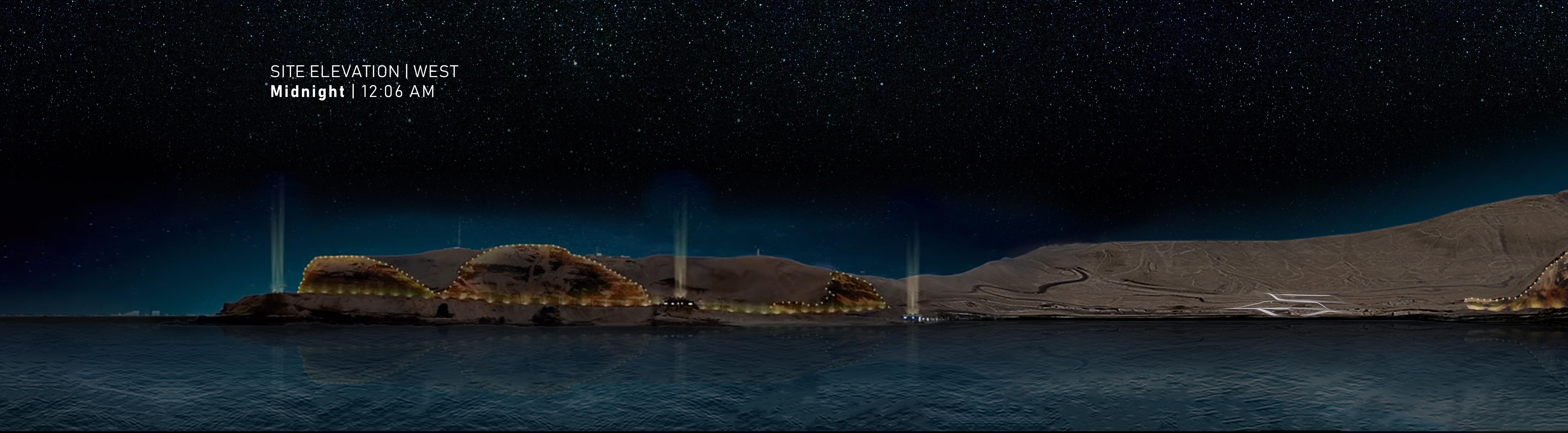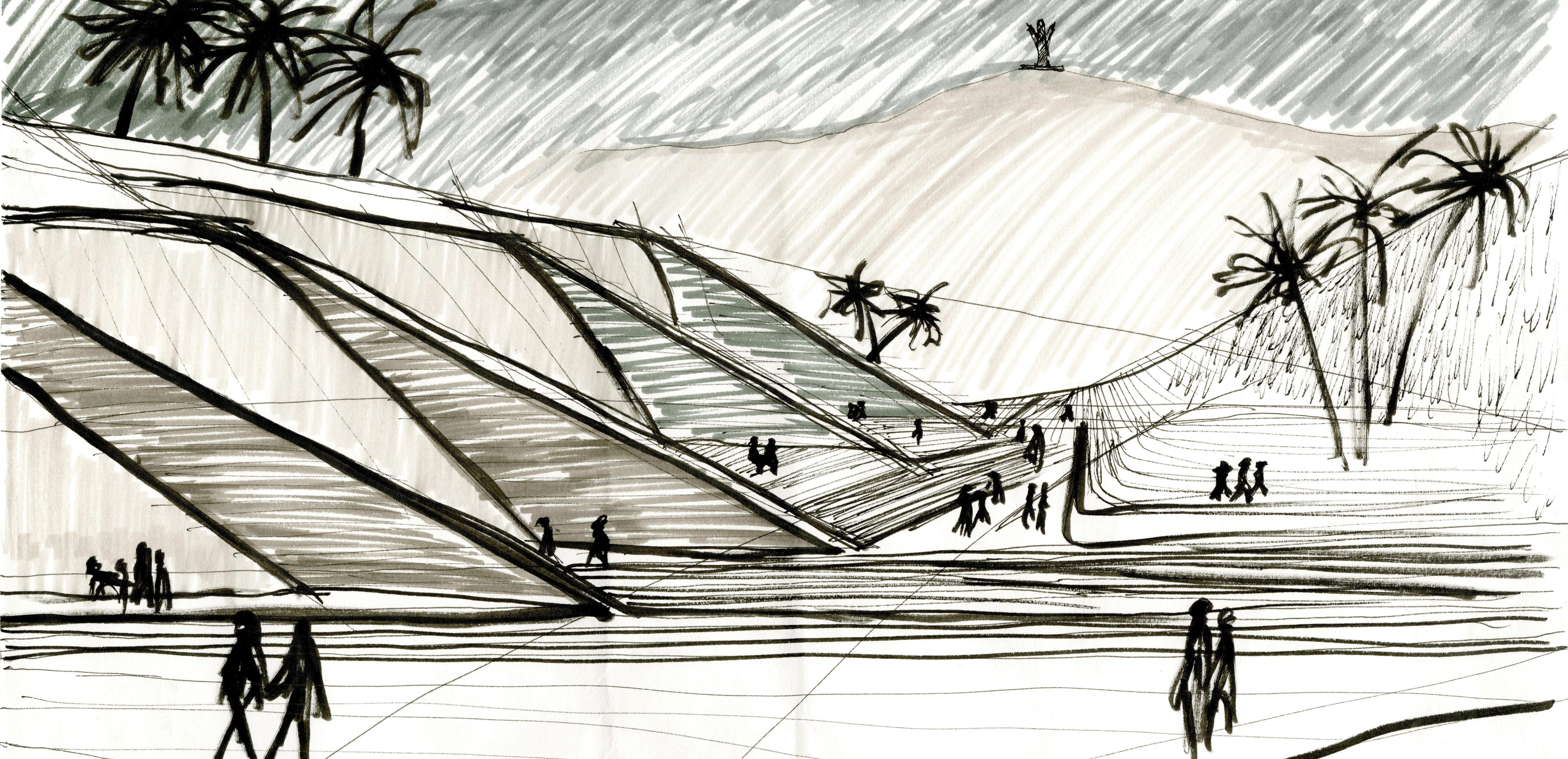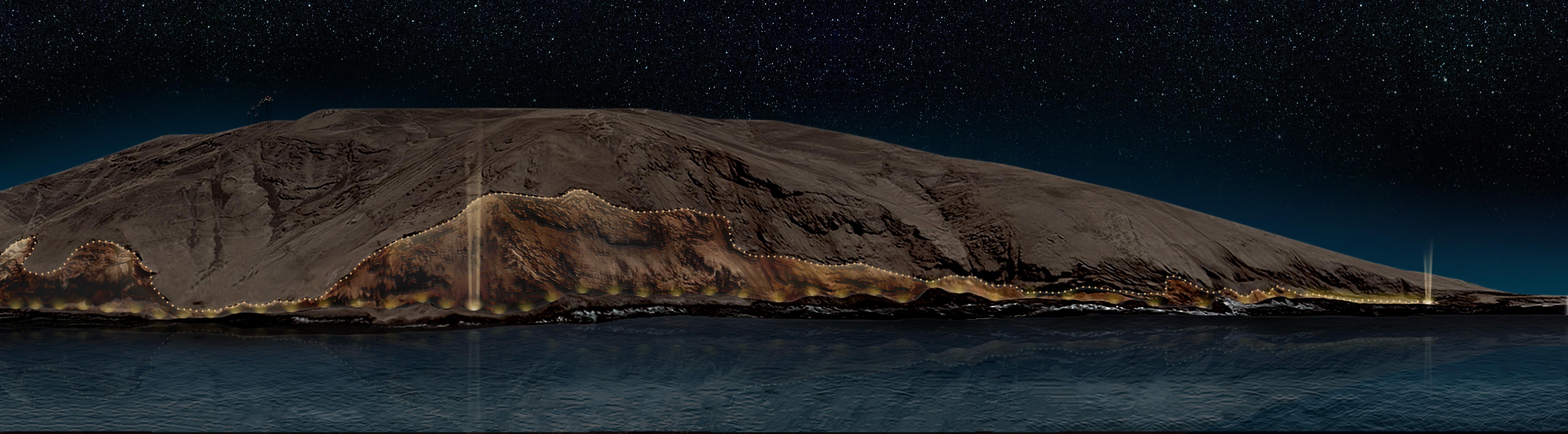 The topography of the site was indeed considered in the form making process, but not by framing specific views, rather suggesting movement through space. Topography lines towards the beachfront naturally descend towards the ocean and wrap around the edge of the mountains. This was an opportunity to work with the topography lines and continue movement of the coastline up and through the southern mountains; something that is currently avoided due to traffic being reversed up and towards the western mountains. Considering both the visual forces and the geometry of the topography, a form naturally presented itself that responded to both these elements. Because entry to the site is enforced by car, the form responded to both pedestrian and vehicle movement, while the endpoints of the form framed a view-port directly toward the specific landmarks of the site. This seemingly abstract illustration of this contextual study directed the form making of the building.