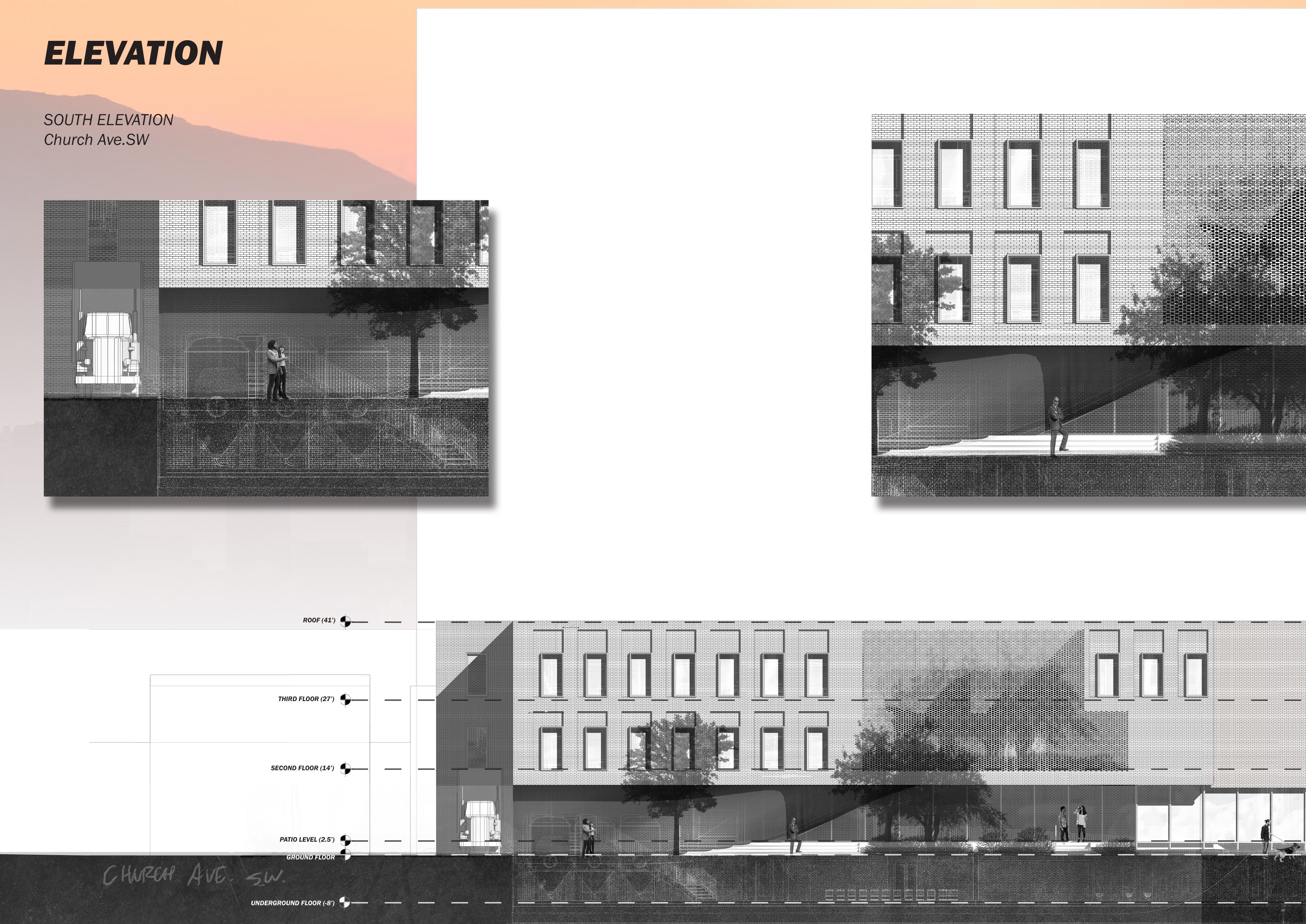 Initial development focused on entry, functionality and visual connections of program studied in elevation.