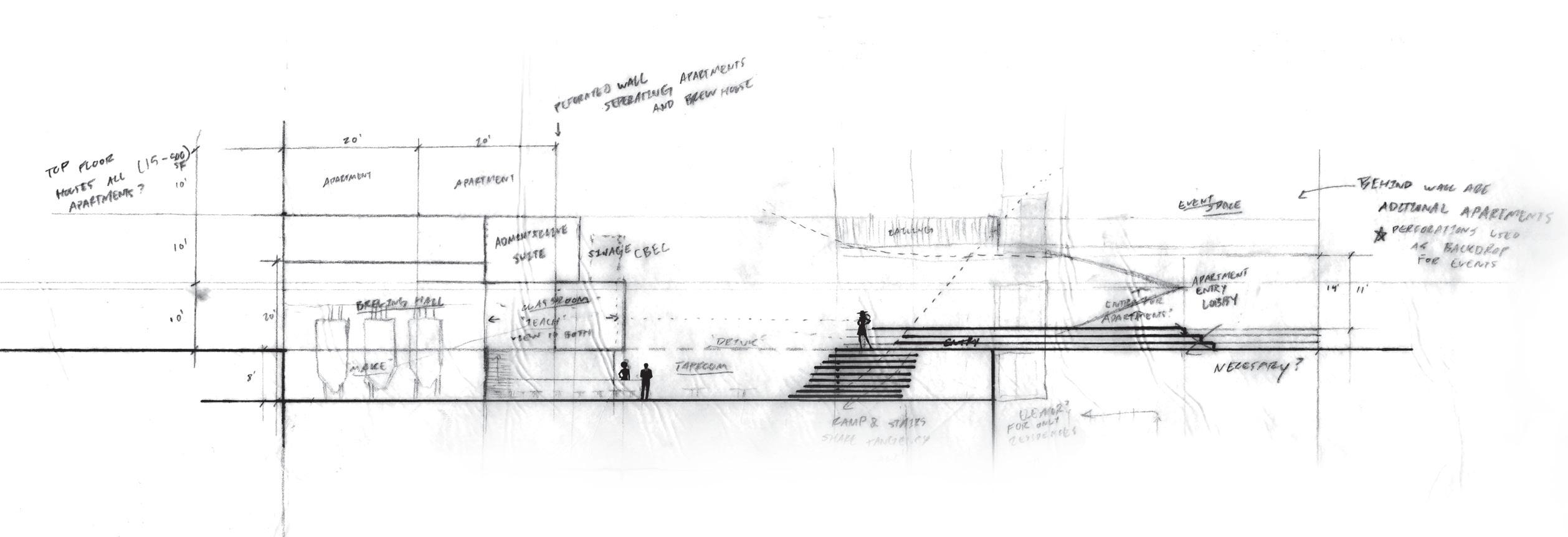 Goal is to create a visual and directional dialog between production space and consumption space through educational space, a space not associated with drinking alcohol.
