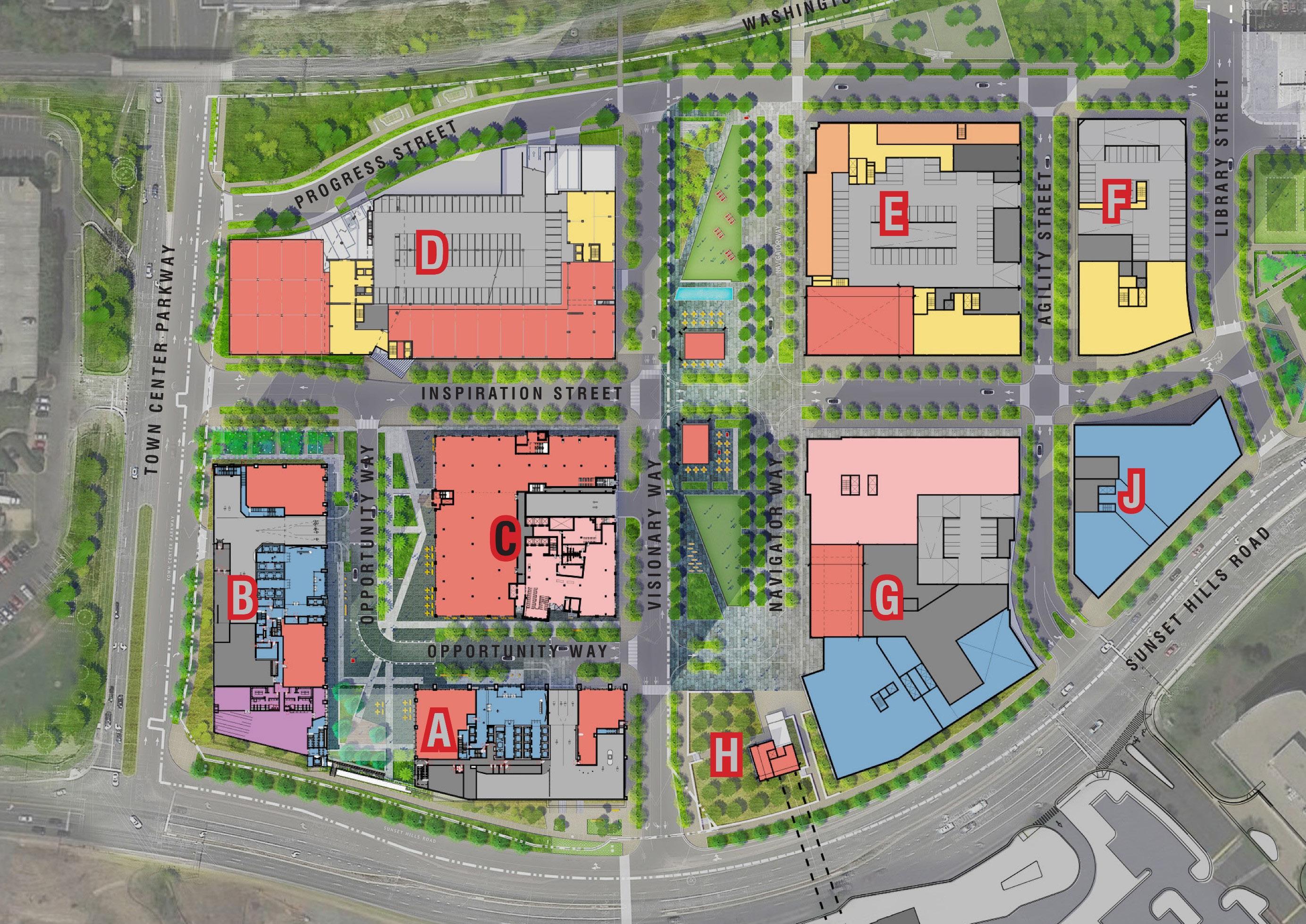“Reston Town Center NXT is a LEED-ND Gold certified new development that extends the original 1990’s Reston Town Center to the new WMATA Metro Silver Line Reston station. The new neighborhood will enlarge the existing walkable, mixed-use community to the Metro station and replace an existing suburban office park and park-and-ride facility.”